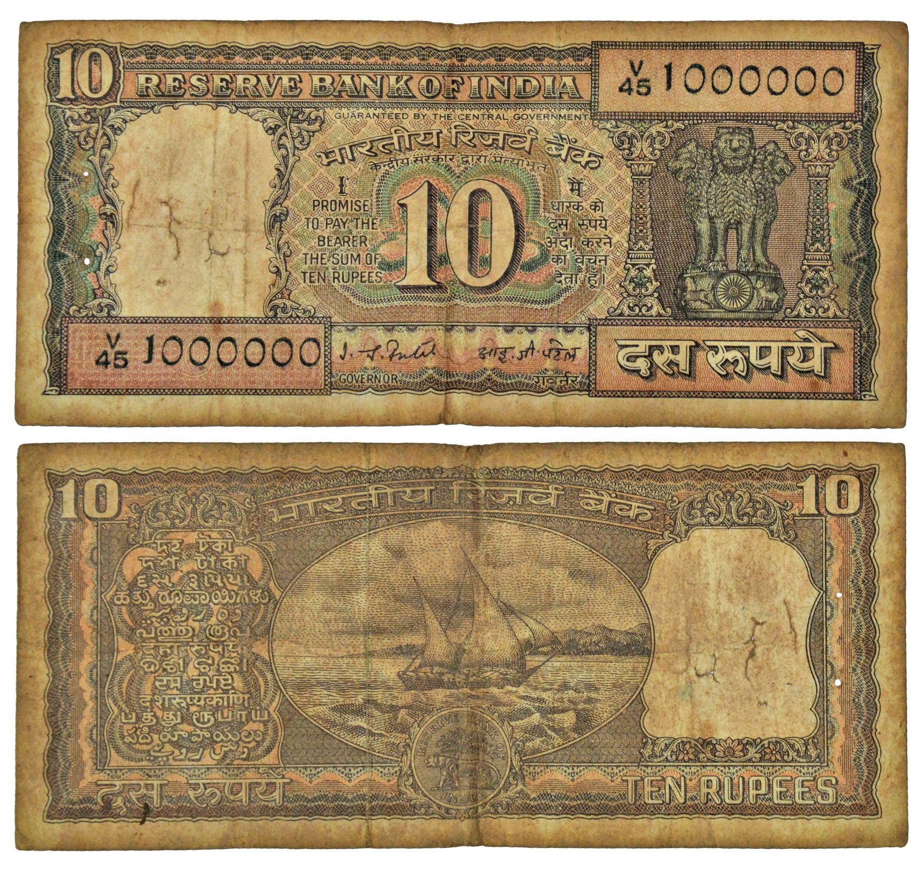 10 rupees, fancy number, ND (1977-1982), signed by I.G. Patel, inset 'C', serial no.: V45 1000000 (1 million). J&R 6.4.8.4A.