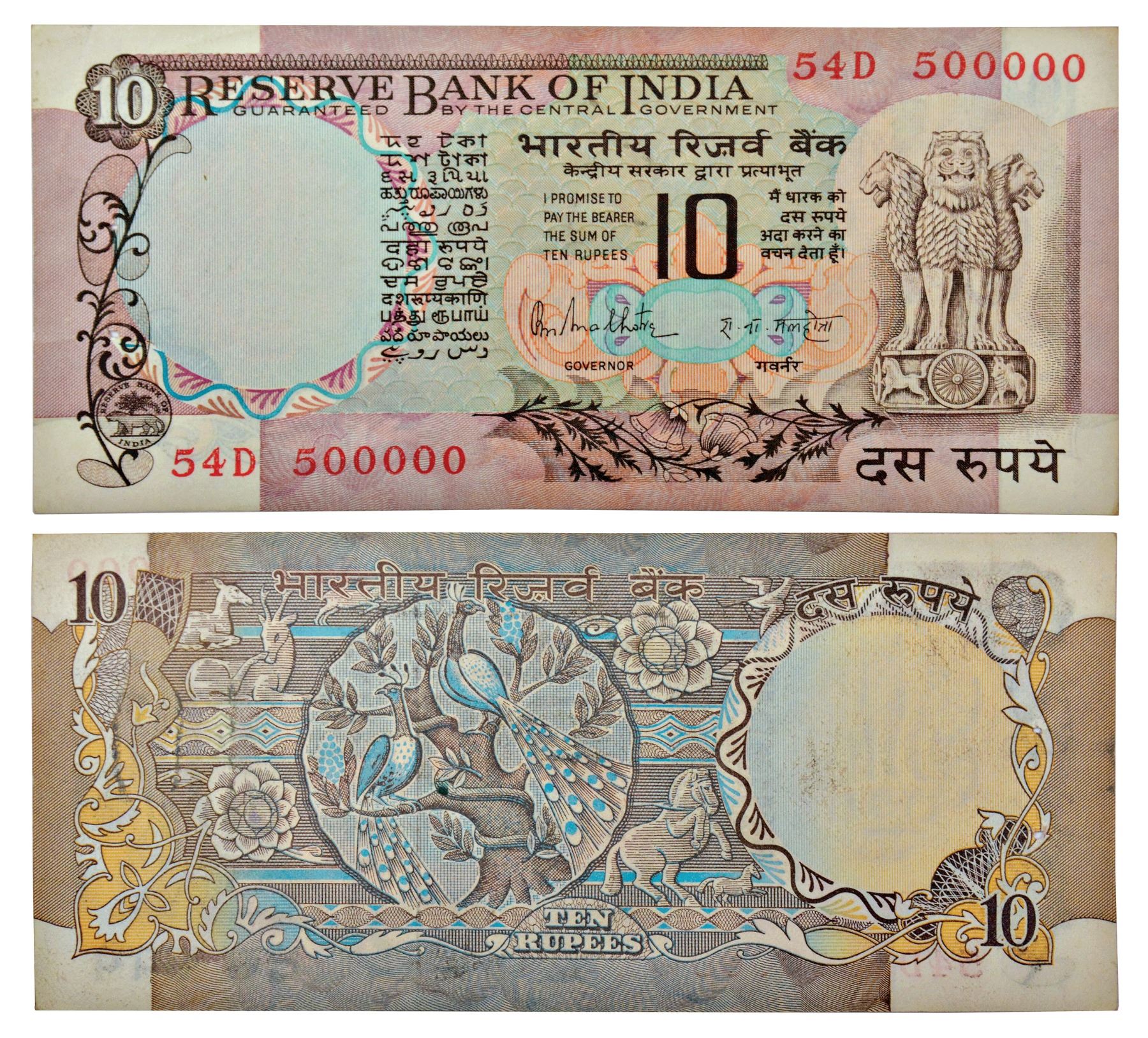 10 rupees, fancy number, Peacock series, ND (1985-1990), signed by R.N. Malhotra, inset 'C', serial no.: 54D 500000, J&R 6.4.9.6B.