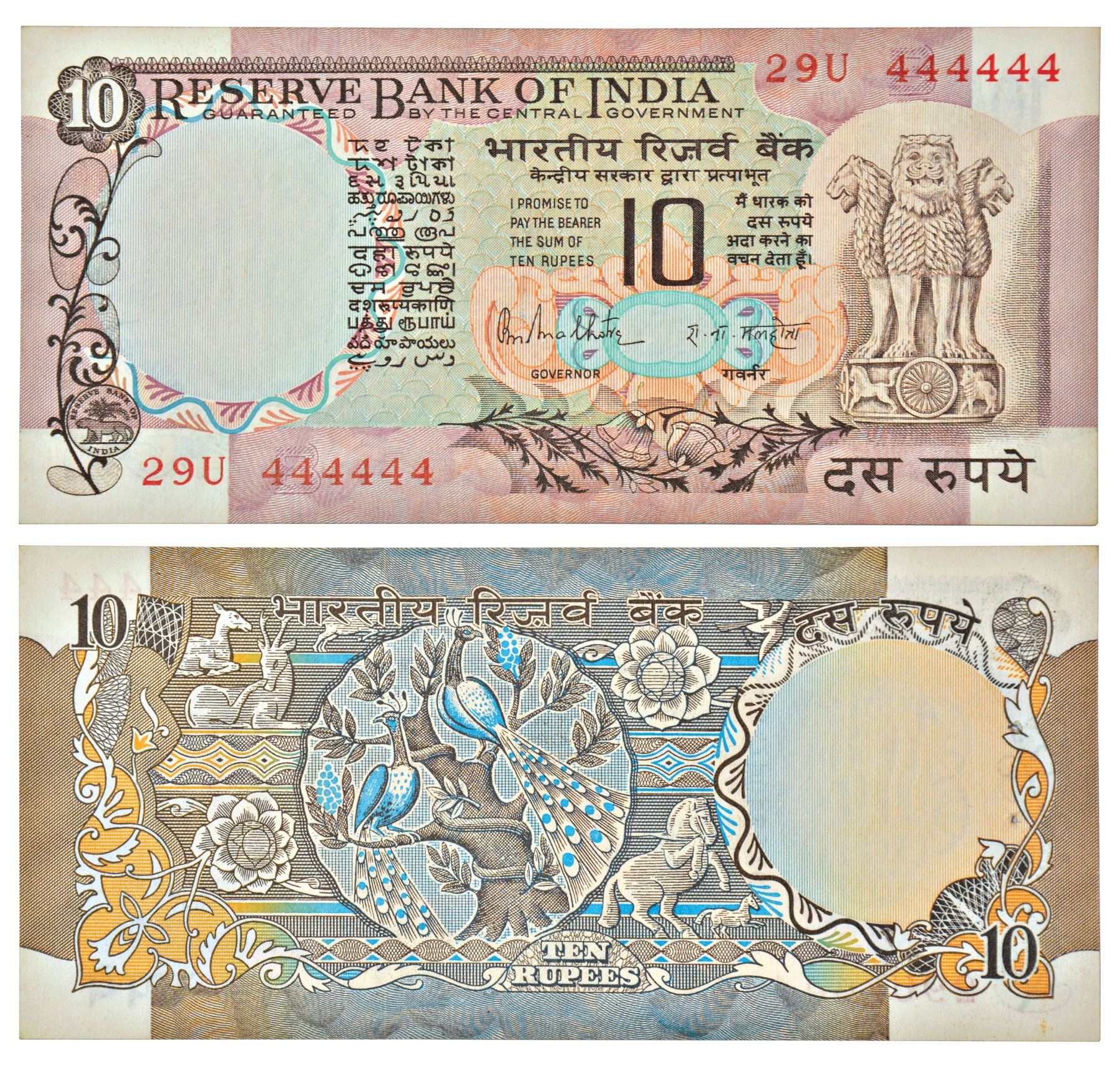 10 rupees, fancy number, Peacock series, ND (1985-1990), signed by R.N. Malhotra, inset 'B', serial no.: 29U 444444. J&R 6.4.9.6A.