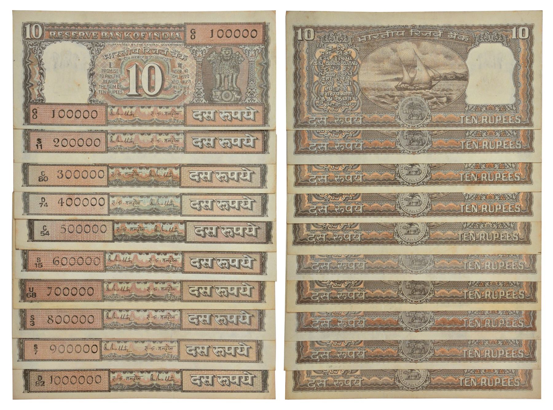 10 rupees, fancy number set of 10 notes, Boat series, ND (1985-1990), signed by R.N. Malhotra, serial no.: 100000 to 1000000, serial no. 700000 and 1000000 have ink mark. (10 notes)