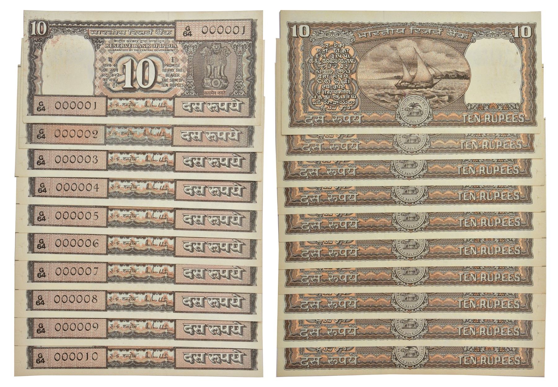 10 rupees, fancy number set of 10 notes, Boat series, ND (1985-1990), signed by R.N. Malhotra, without inset, serial no.: G64 000001 to 000010, J&R 6.4.10.1. (10 notes)