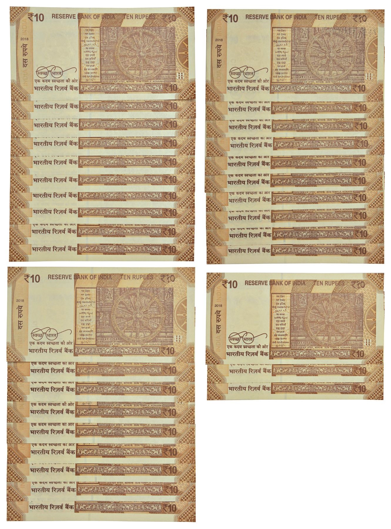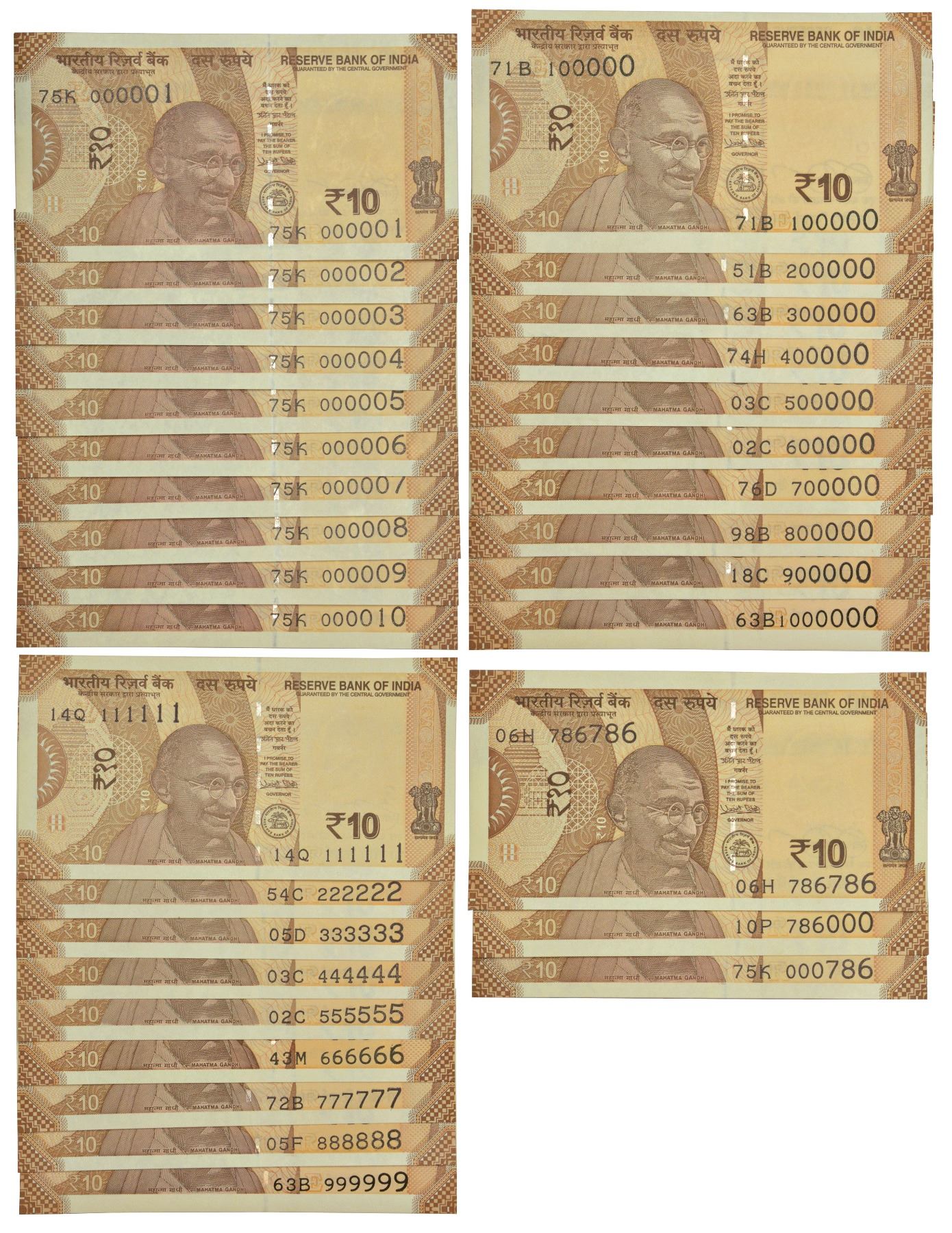 10 rupees, fancy number set of 32 notes, new Gandhi series, signed by Urjit Patel, telescopic serial no.: 111111 to 999999, 100000 to 1000000, 000001 to 000010, 786786, 786000 and 000786, 13x 2017- serial no.: 222222, 333333, 444444, 555555, 777777, 888888, 200000, 300000, 500000, 600000, 700000, 800000, 900000; and 19x 2018- serial no.: 111111, 666666, 999999, 100000, 400000, 1000000, 000001 to 000010, 786786, 786000 and 000786. (32 notes)
