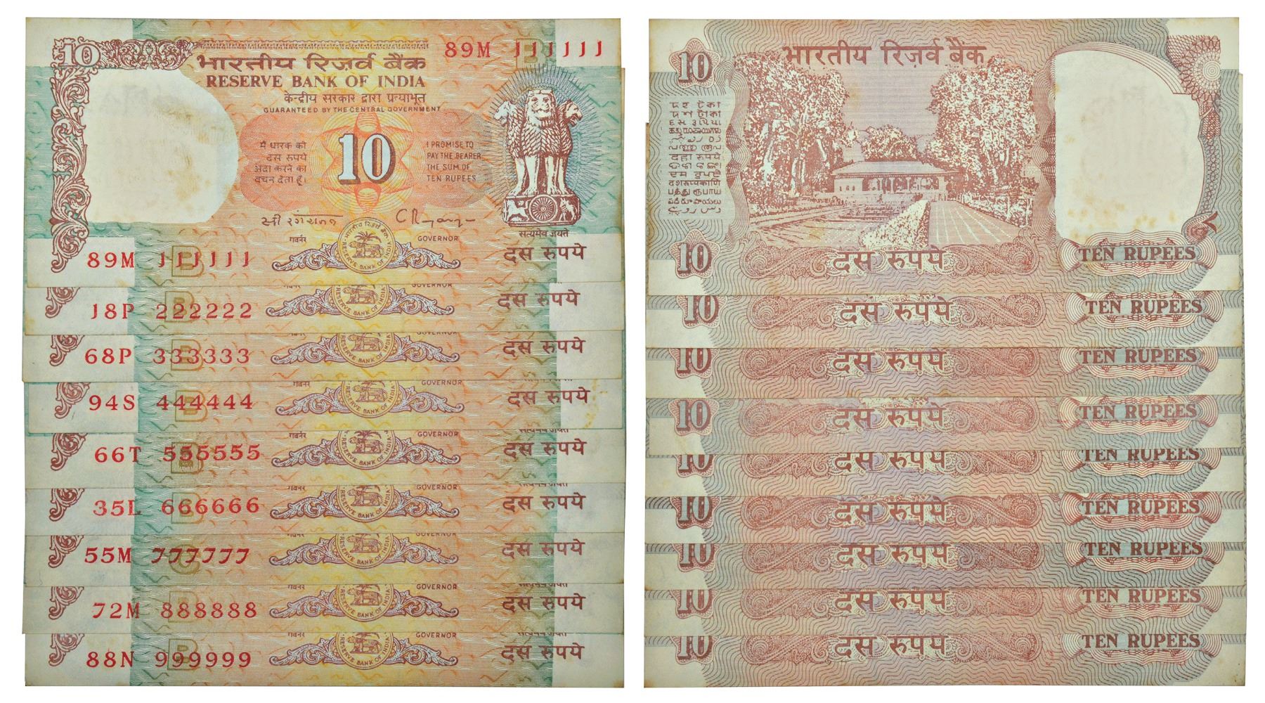 10 rupees, fancy number set of 9 notes, Shalimar Garden series, ND (1992-1997), signed by C. Rangarajan, serial no.: 111111 to 999999. (9 notes)