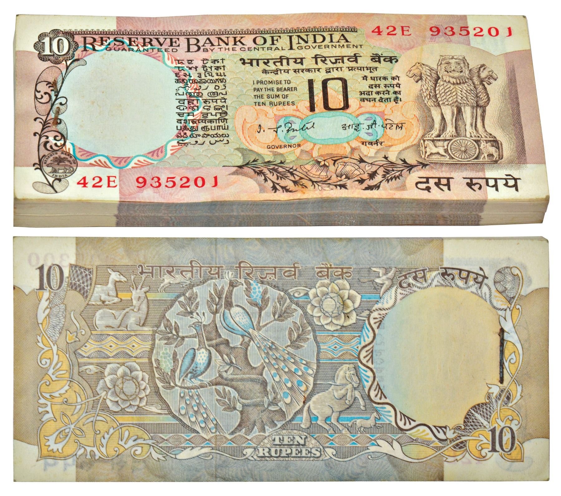 10 rupees, full packet of 100 notes, Peacock series, ND (1977-1982), signed by I.G. Patel, inset 'A', serial no.: 42E 935201 to 935300.