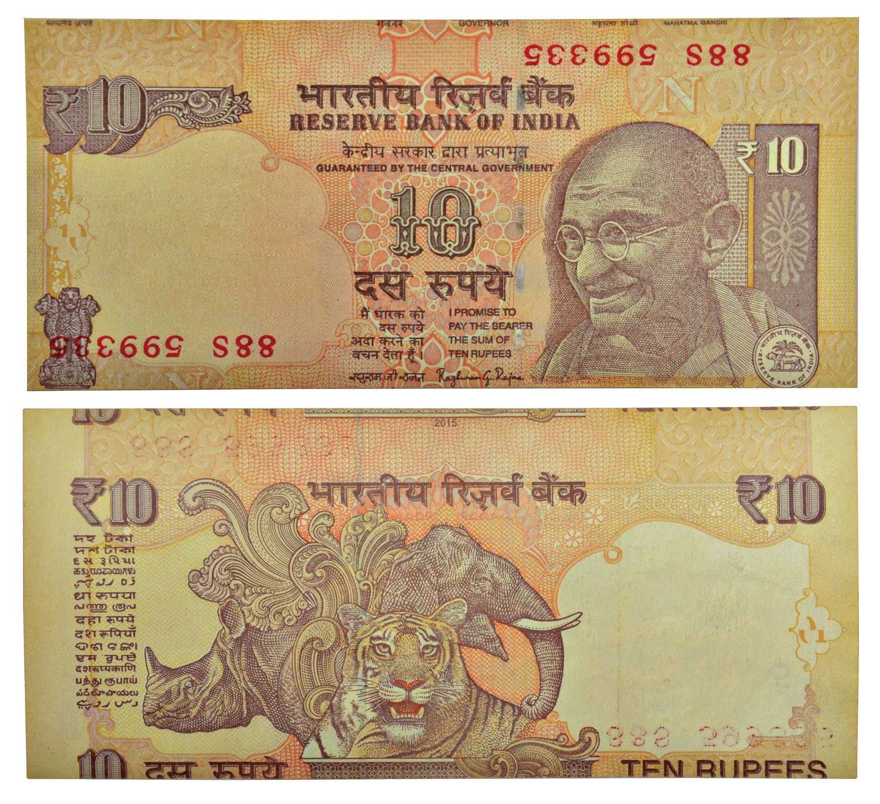 10 rupees, misprint, 2015, gandhi series, signed by Raghuram G. Rajan, inset 'N', serial no.: 88S 599335, both serial numbers are inverted and printing shifted.