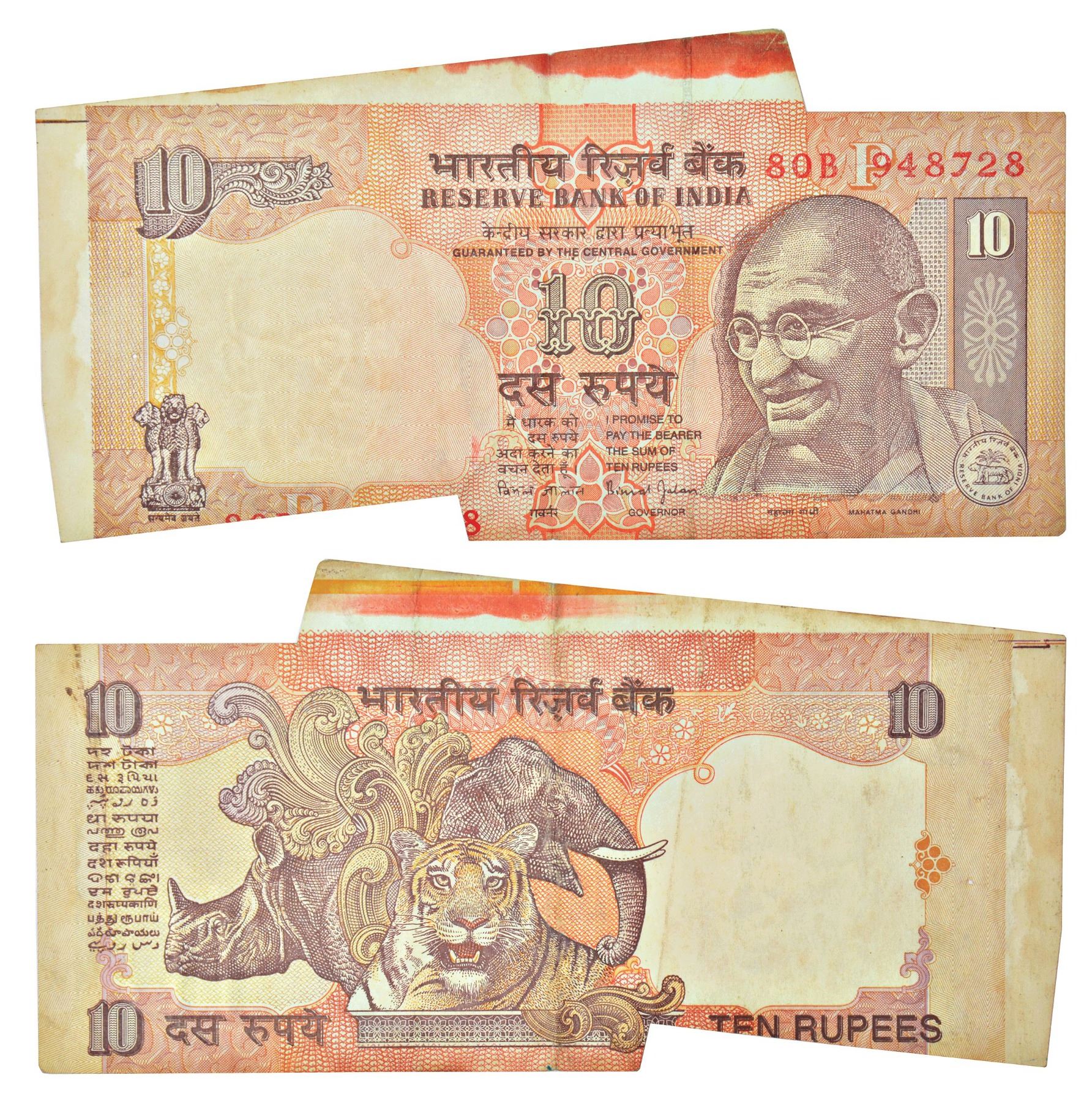10 rupees, misprint, Gandhi series, ND (1997-2008), signed by Bimal Jalan, inset 'P', serial no.: 80B 948728, misaligned cutting part of sheet error.