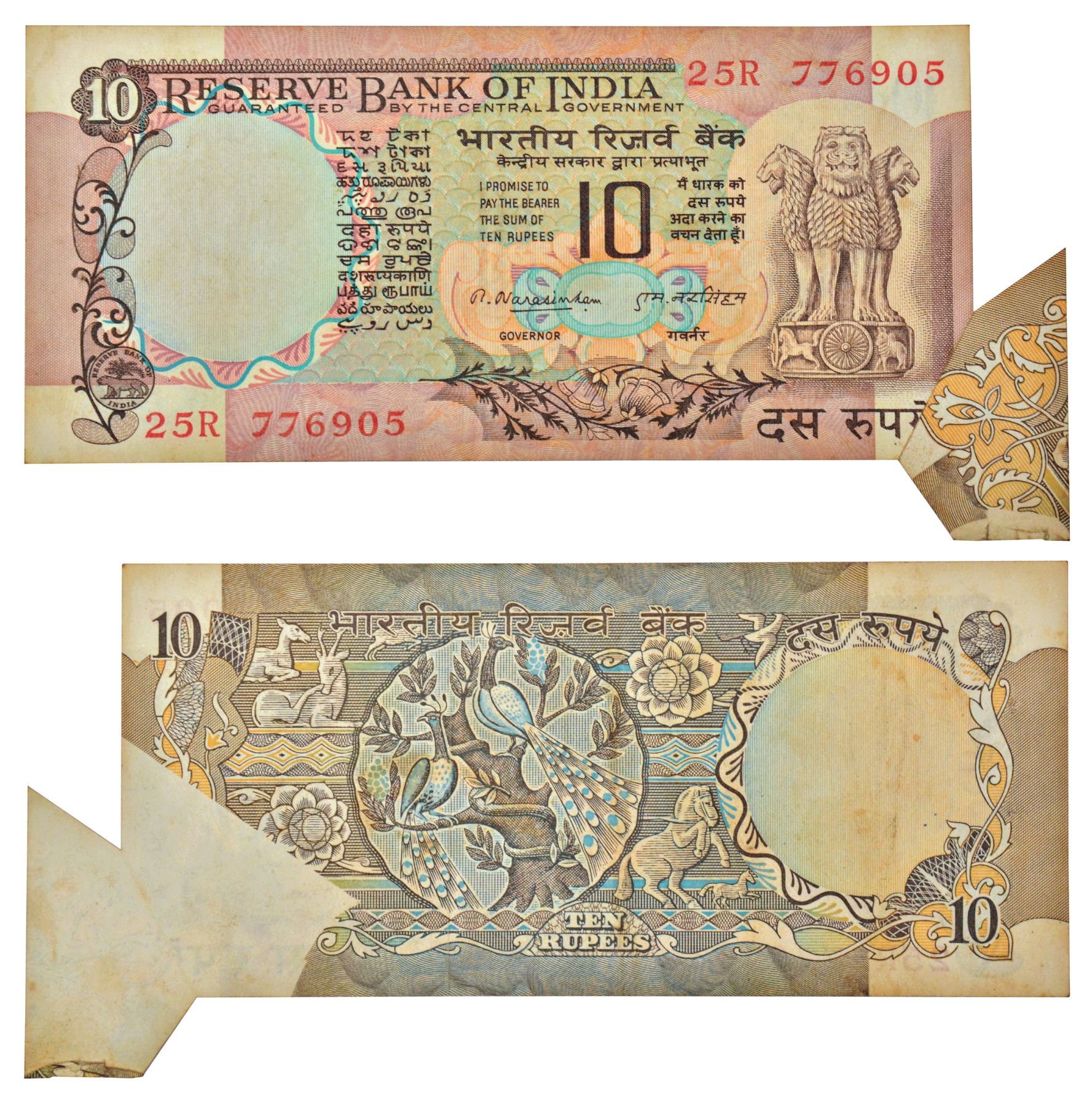 10 rupees, misprint, Peacock series, ND (1977), signed by M. Narsimham, without inset, serial no.: 25R 776905, flip error on reverse.