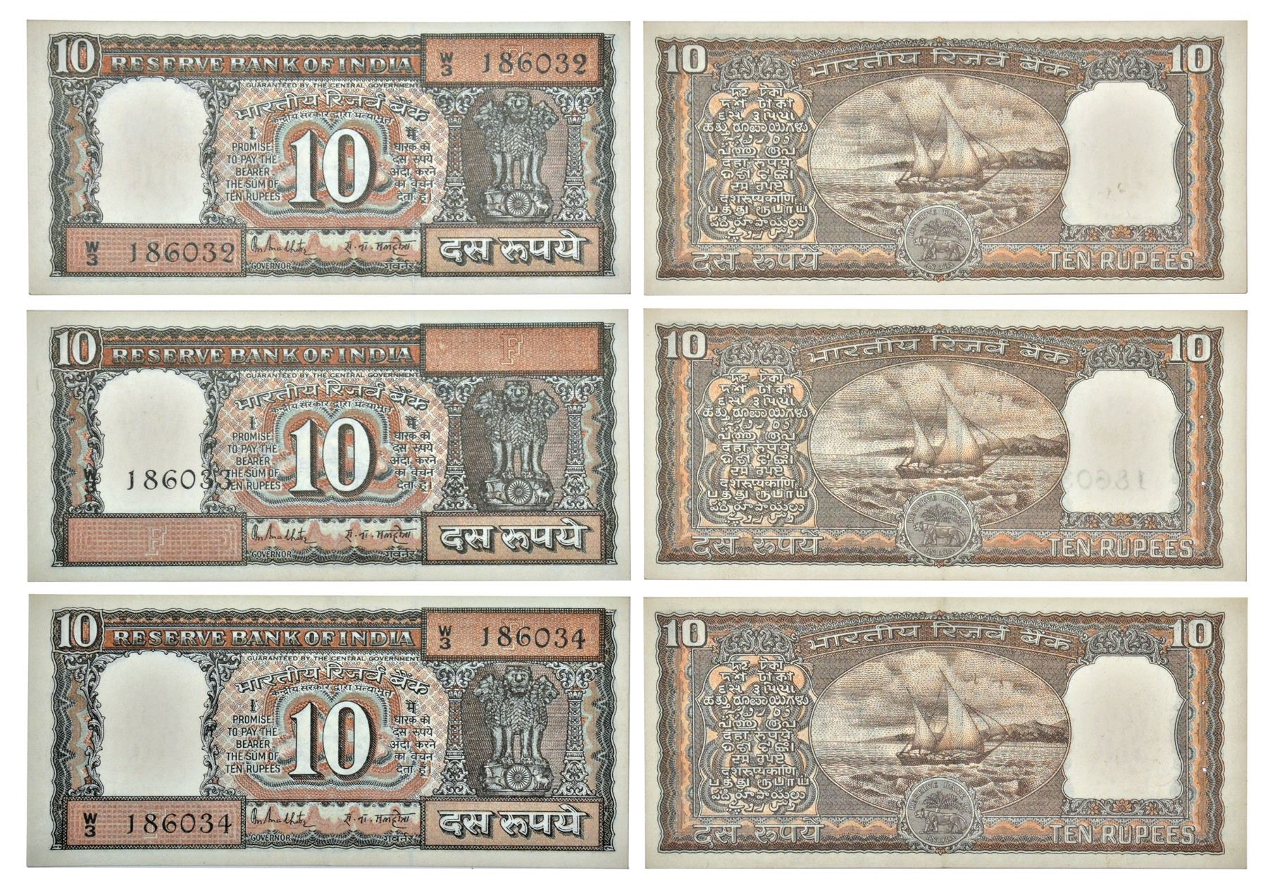 10 rupees, misprint notes (3), Boat series, ND (1985-1990), signed by R.N. Malhotra, inset 'F', serial no.: 186032, 186033 and 186034; serial no. 186033 upper right-side serial no. not printed and lower left number shifted, rest 2 notes are common.