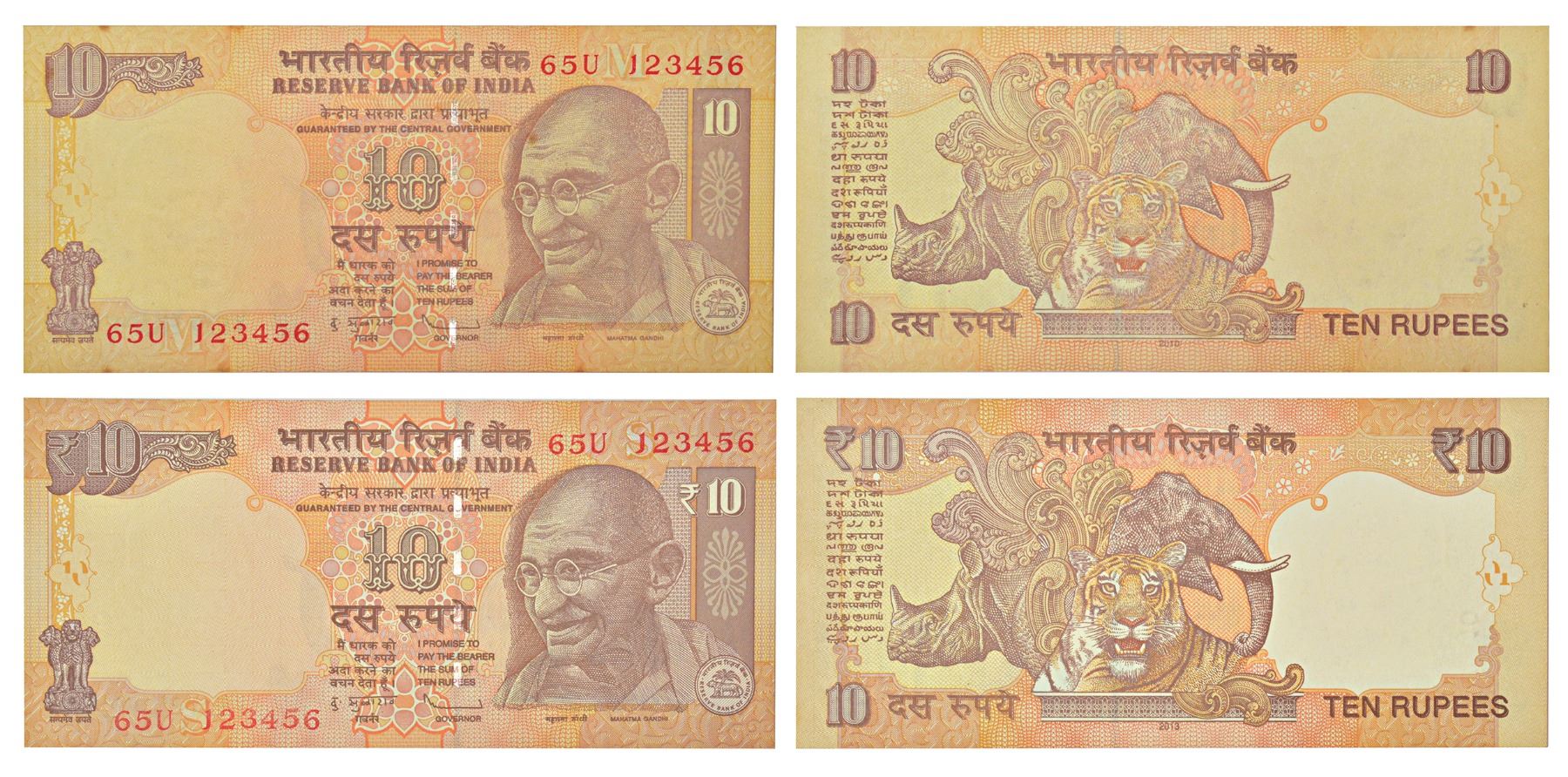 10 rupees, pair of two fancy number notes, Gandhi series, signed by D. Subbarao, 1x 2010 and 1x 2013, both notes have same serial no. and prefix 65U 123456. (2 notes)