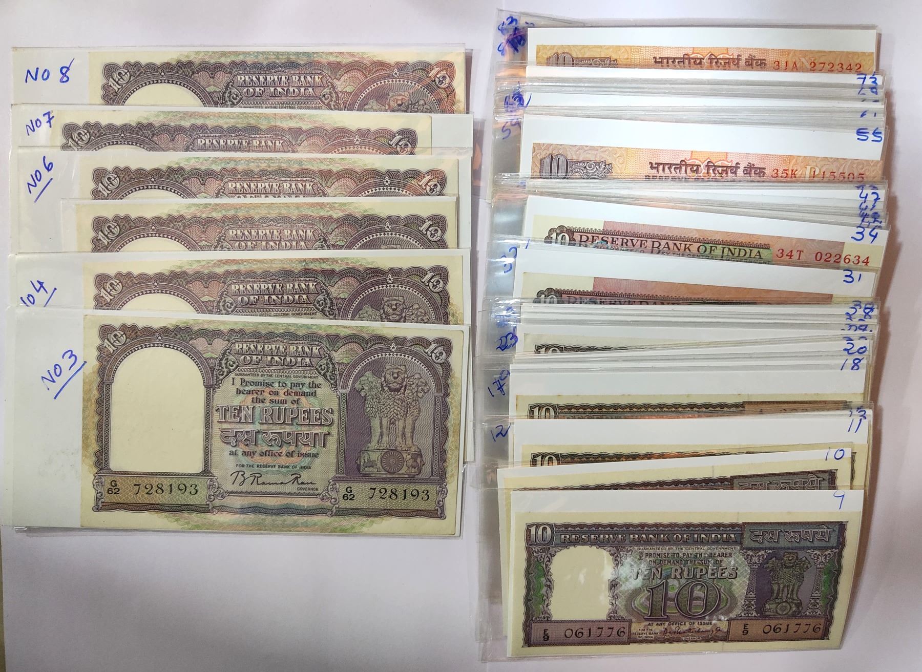 10 rupees, set of 81 different notes (2 notes missing from complete set of 83 notes), 1951 to 2010, with different types and signature. First two notes are missing. (81 notes)
