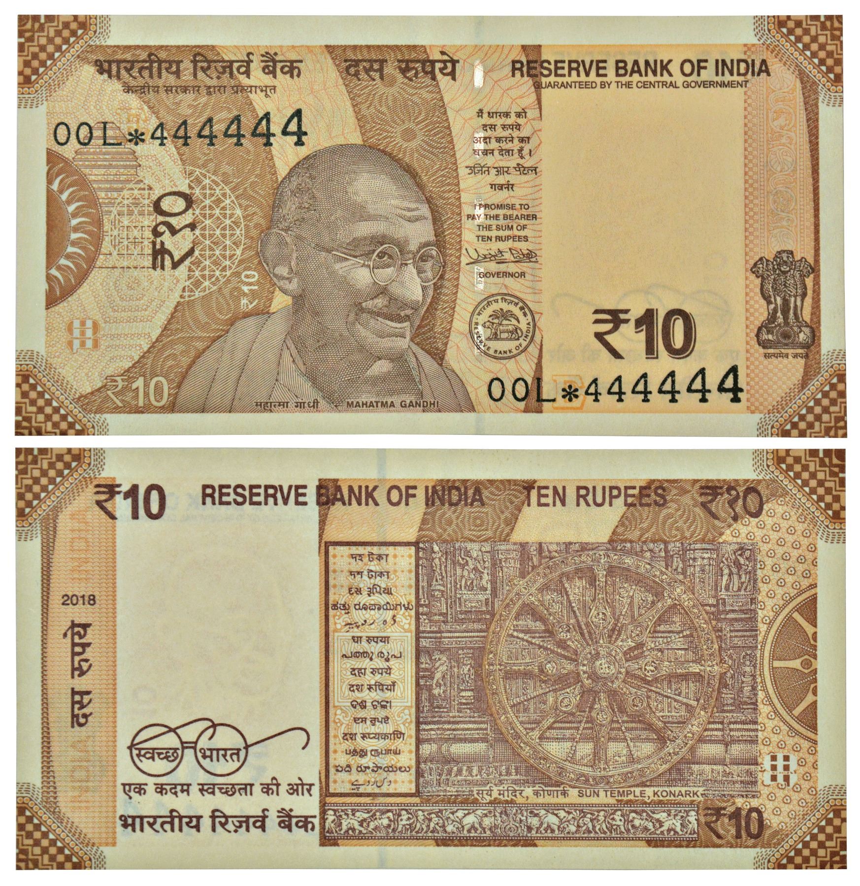 10 rupees, star fancy number, Gandhi series, 2018, signed by Urjit Patel, inset 'E', serial no.: 00L*444444.
