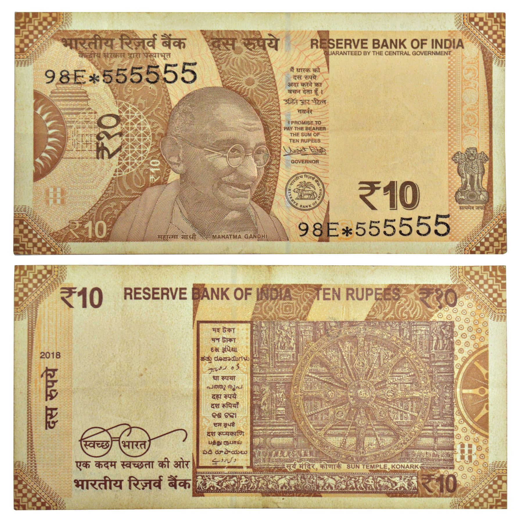10 rupees, star series, fancy number, 2018, gandhi series, signed by Urjit R. Patel, inset 'S', serial no.: 98E* 555555.