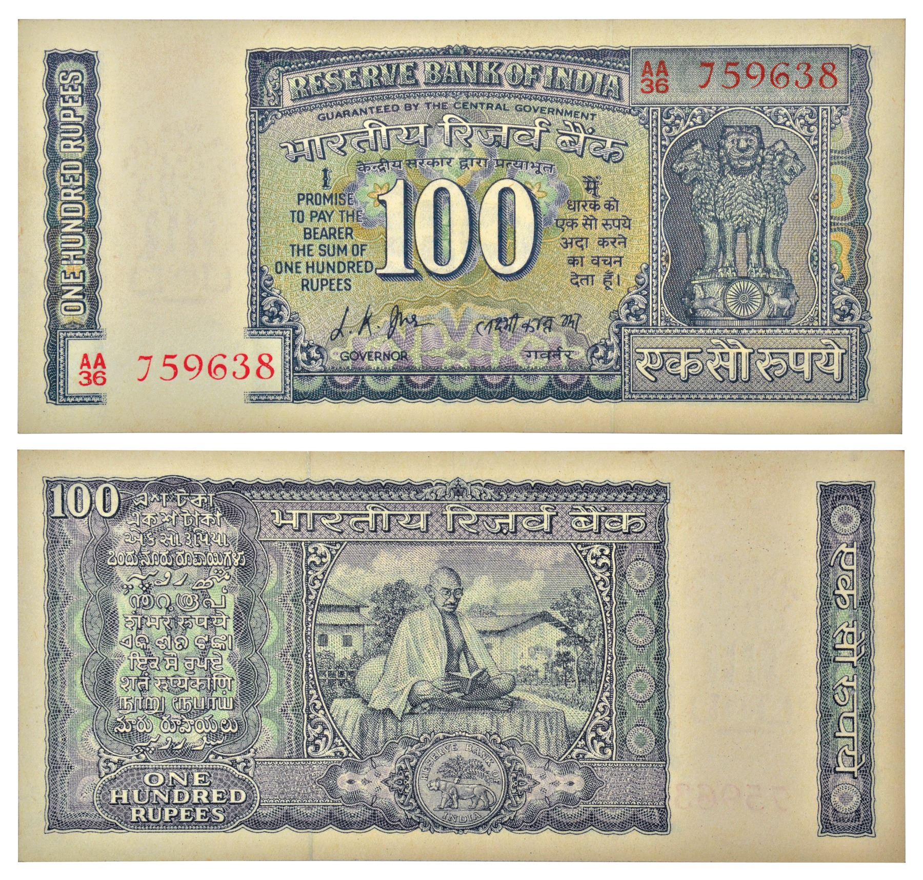 100 Rupees, Gandhi on back series, ND (1969), signed by L. K. Jha, serial no.: AA36 759638, J&R 6.7.6.1.