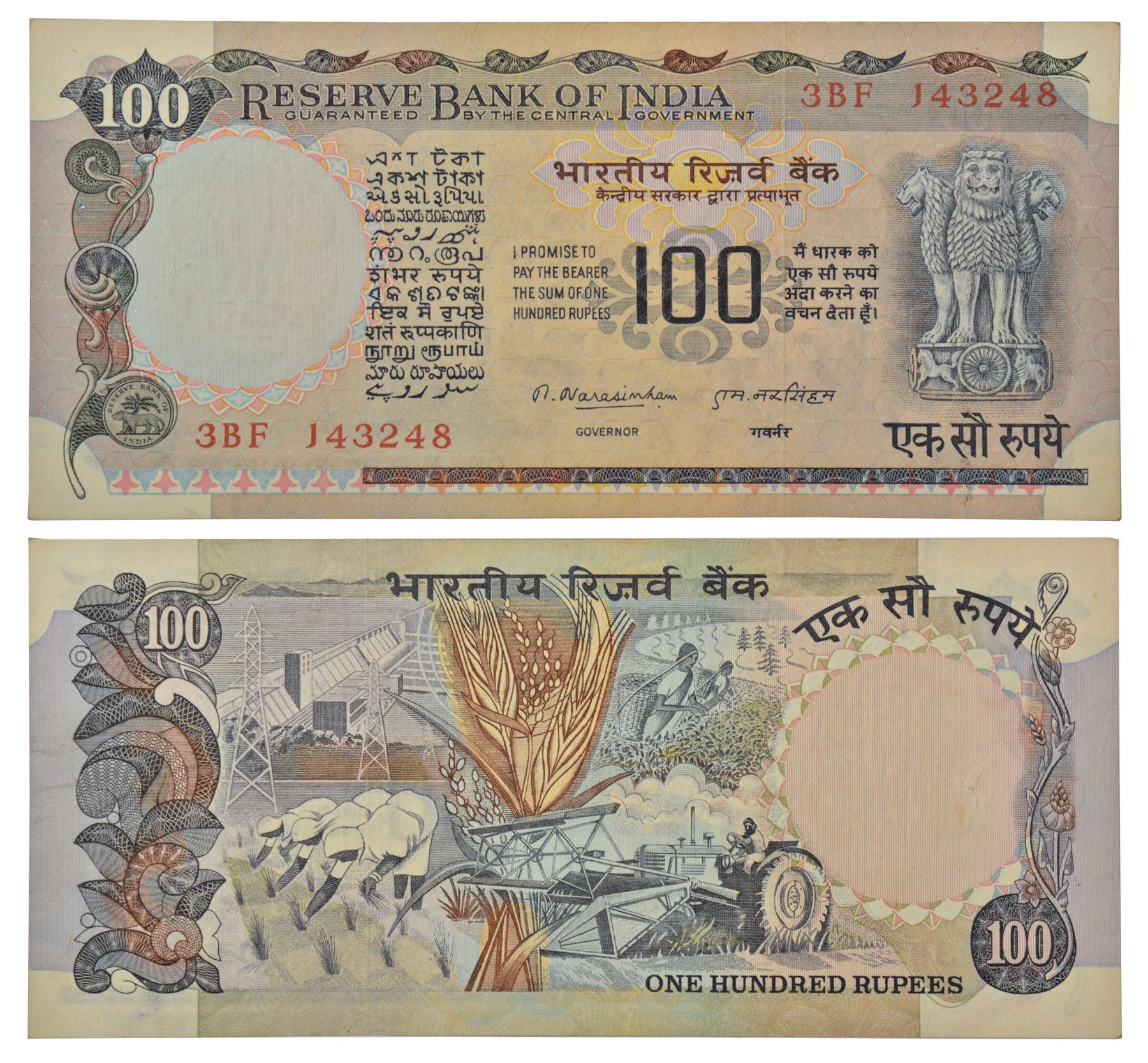 100 rupees, Agriculture series, ND (1977), signed by M. Narasimham, without inset, serial no.: 3BF 143248, J&R 6.7.8.3.