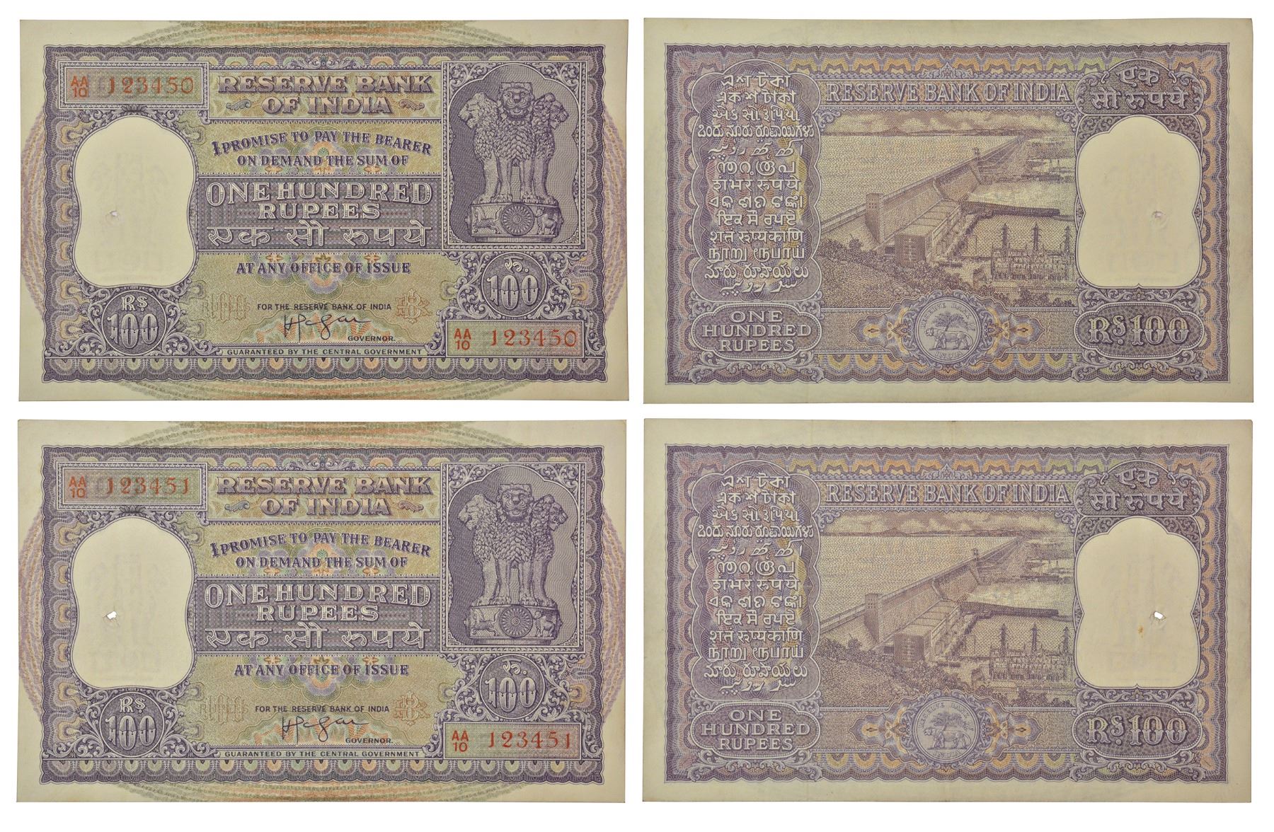100 rupees, Dam series, ND (1957-1962), signed by H.V.R. Iyengar, without inset, two consecutive serial no.: AA10 123450 (semi fancy no.) and 123451, J&R 6.7.4.1. (2 consecutive notes)