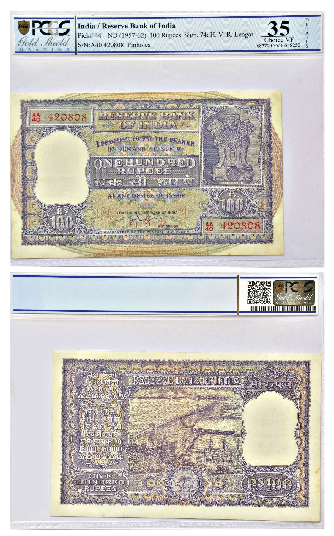 100 rupees, Dam series, ND (1957-62), signed by H.V.R. Iyengar, without inset, serial no.: AA40 420808 in red, J&R 6.7.4.1.