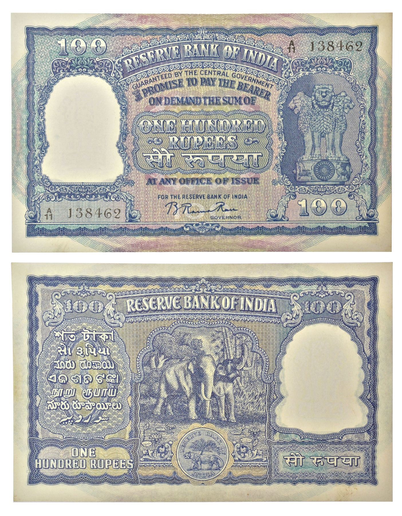 100 rupees, Elephant series, ND (1951), Bombay circle, signed by B. Rama Rau, incorrect रूपया in Hindi, serial no.: A11 138462 in black, J&R 6.7.2.1A. Uncirculated, Rare.
