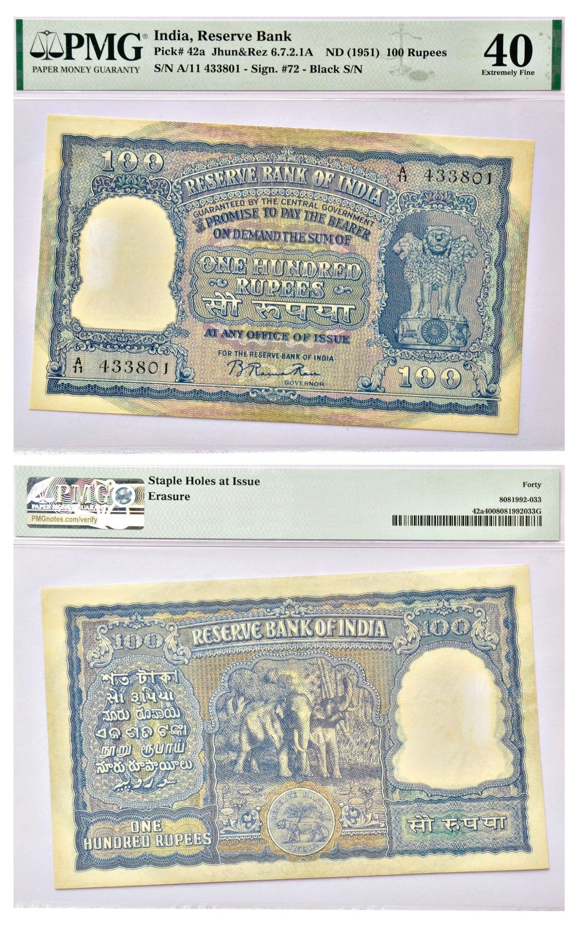 Paper Money: 100 rupees, Elephant series, ND (1951), Bombay circle, signed by B. Rama Rau, incorrect