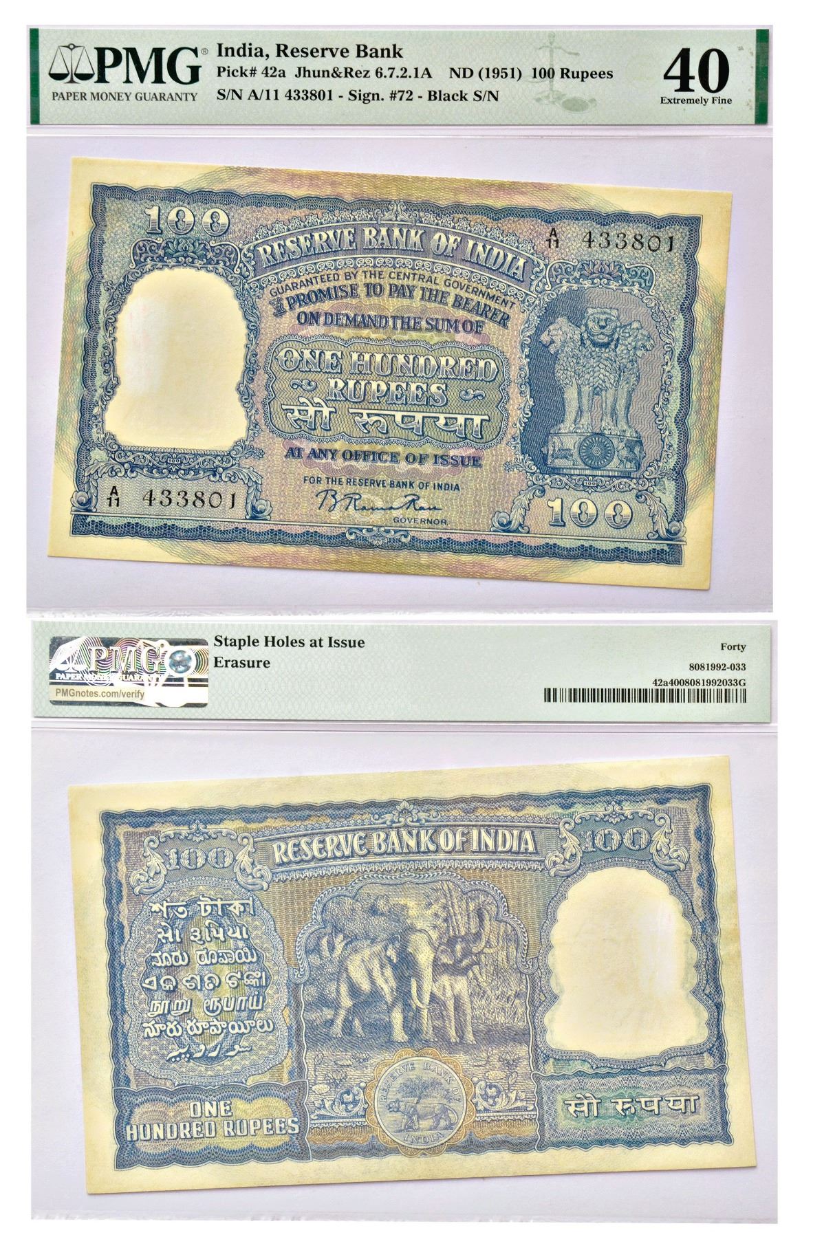 Paper Money: 100 rupees, Elephant series, ND (1951), Bombay circle, signed by B. Rama Rau, incorrect