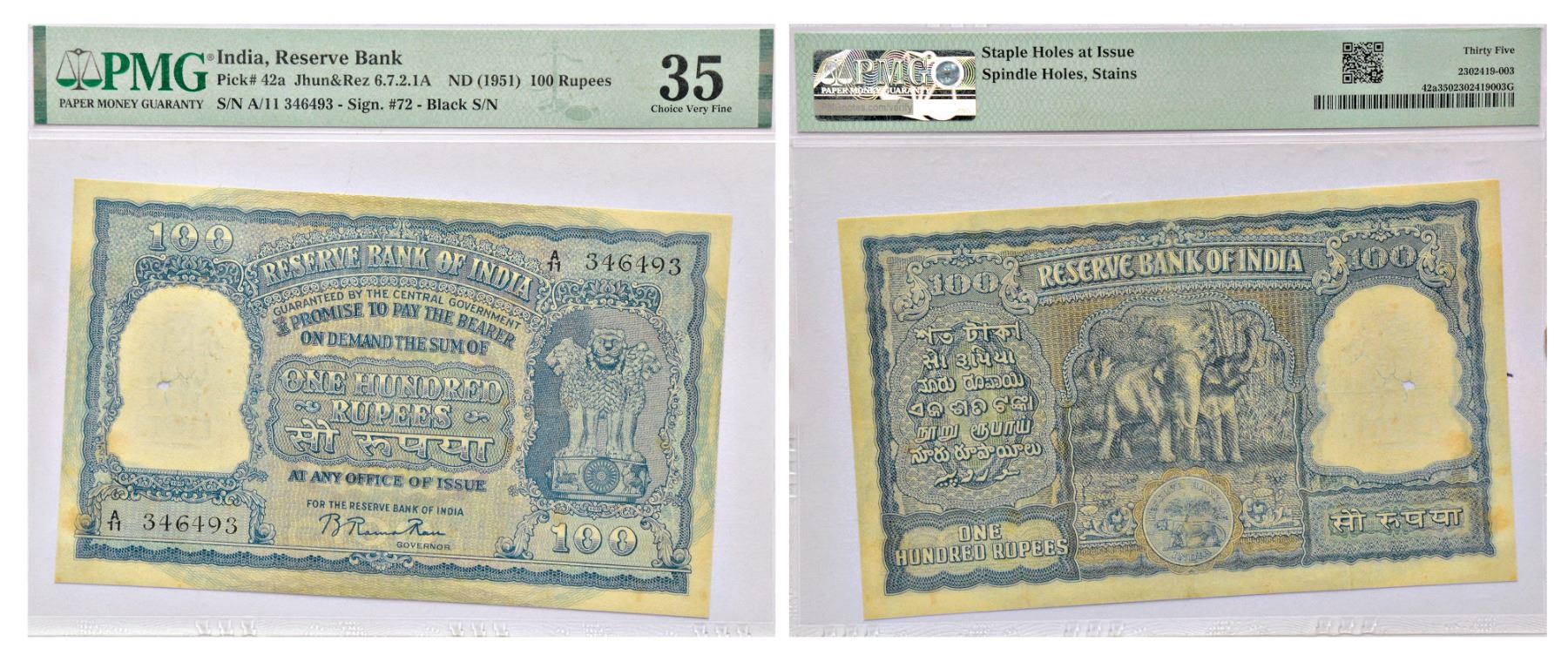 Paper Money: 100 rupees, Elephant series, ND (1951), signed by B. Rama Rau, incorrect पया in Hindi, serial no.: A11 346493 in black, J&R 6.7.2.1A.