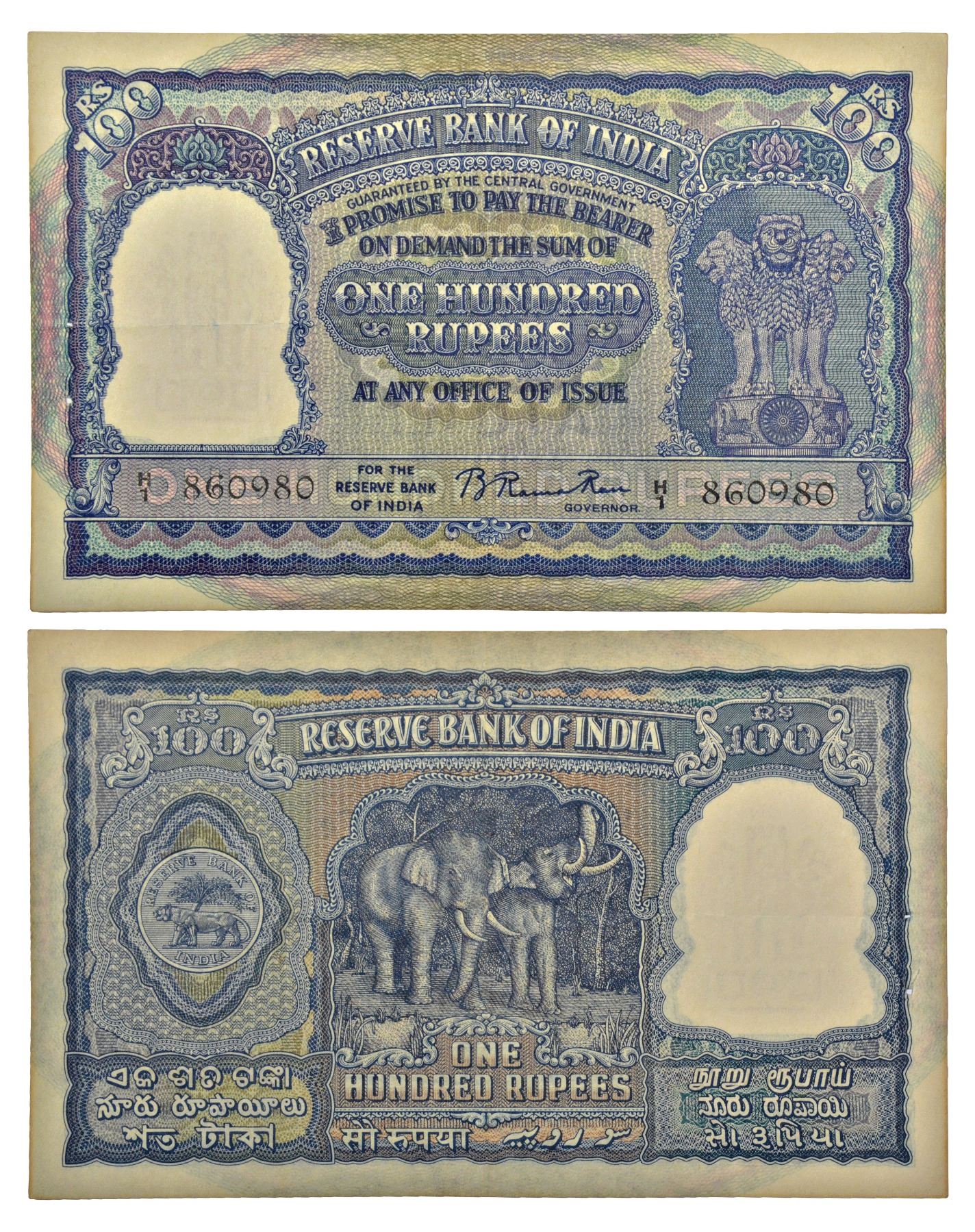 100 rupees, ND (1950), Calcutta circle, signed by B. Rama Rau, value in English in the center, serial no.: H1 860980. J&R 6.7.1.1, crease in center.