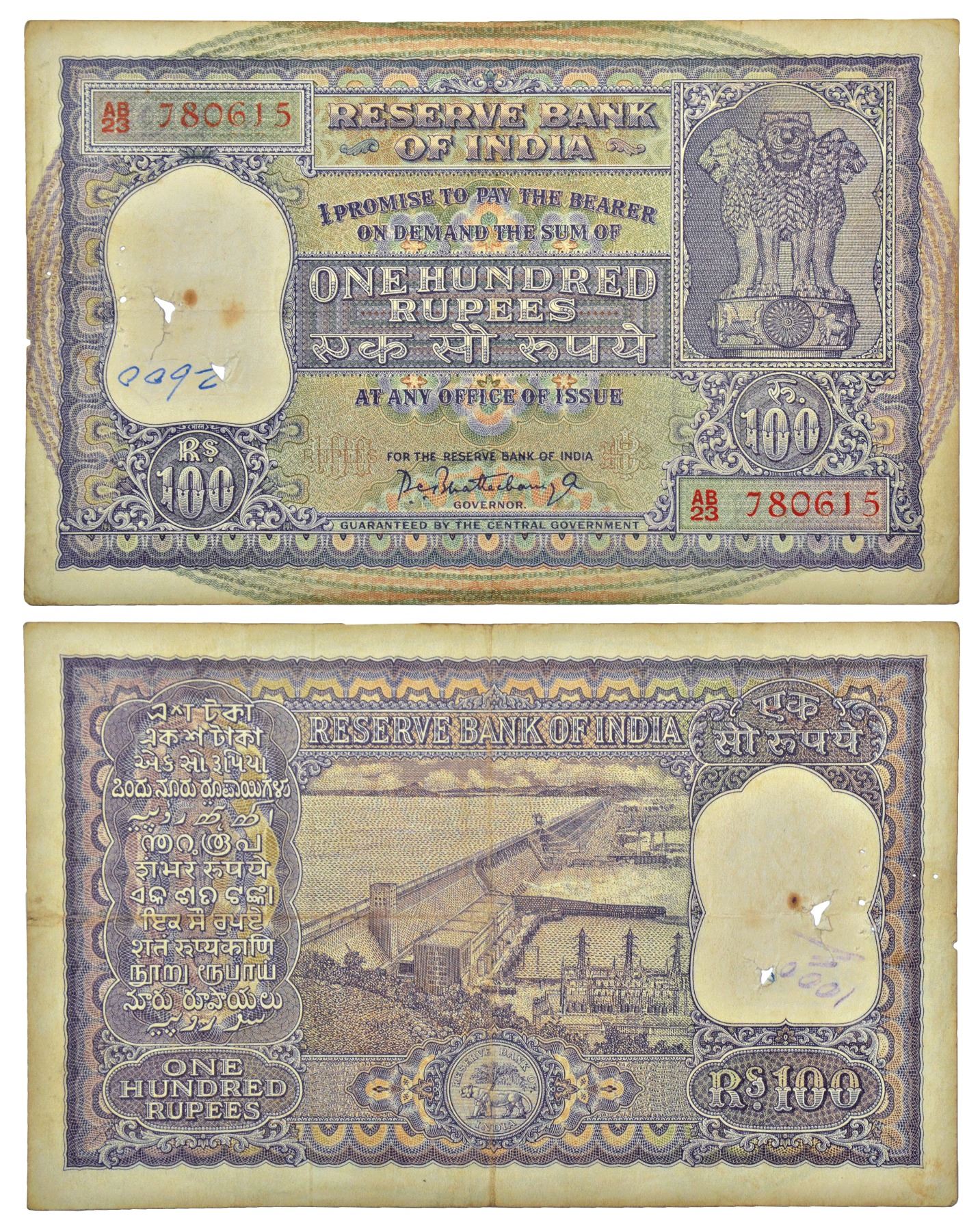 100 rupees, ND (1962-67), signed by P.C. Bhattacharya, serial no.: AB23 780615 in red. J&R 6.7.4.2, thread holes.