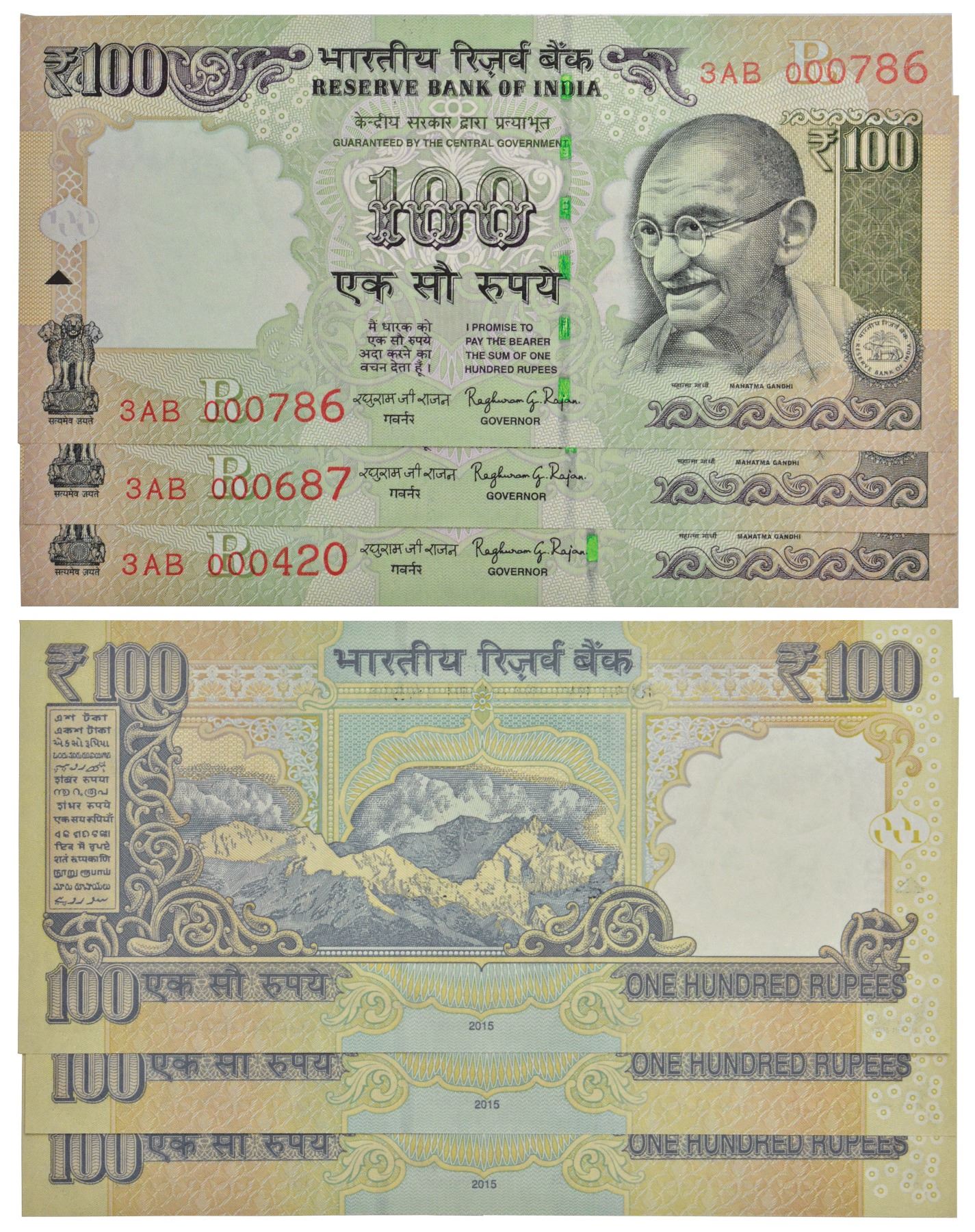 100 rupees, fancy and semi fancy notes (3), 2015, signed by Raghuram Rajan, inset 'R', telescopic serial no.: 1x 3AB 000786, 1x 3AB 000687 (reverse 786), semi fancy serial no.: 1x 3AB 000420.(3 notes)