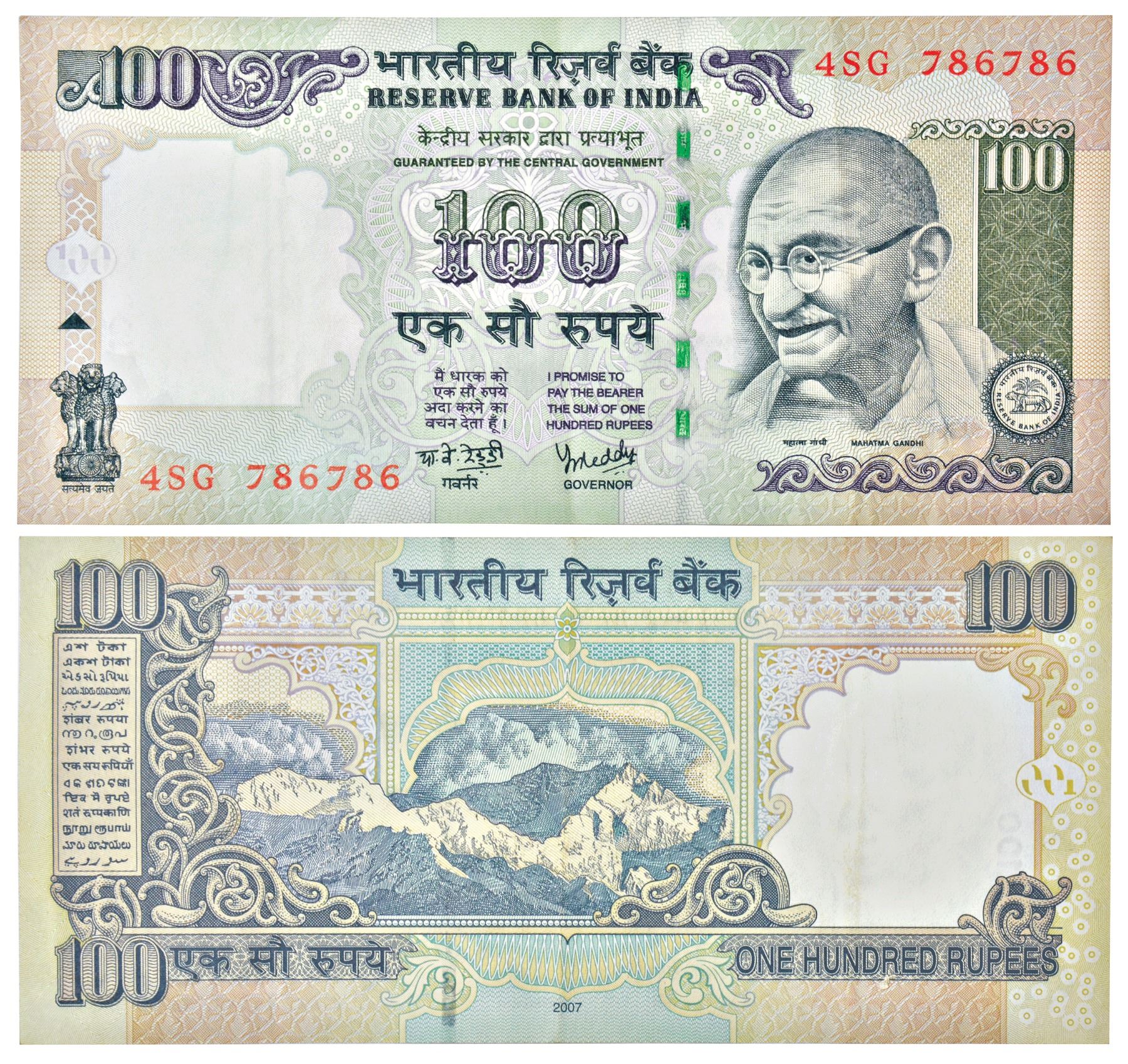 100 rupees, fancy number, Gandhi series, 2007, signed by Y. V. Reddy, without inset, serial no.: 4SG 786786.
