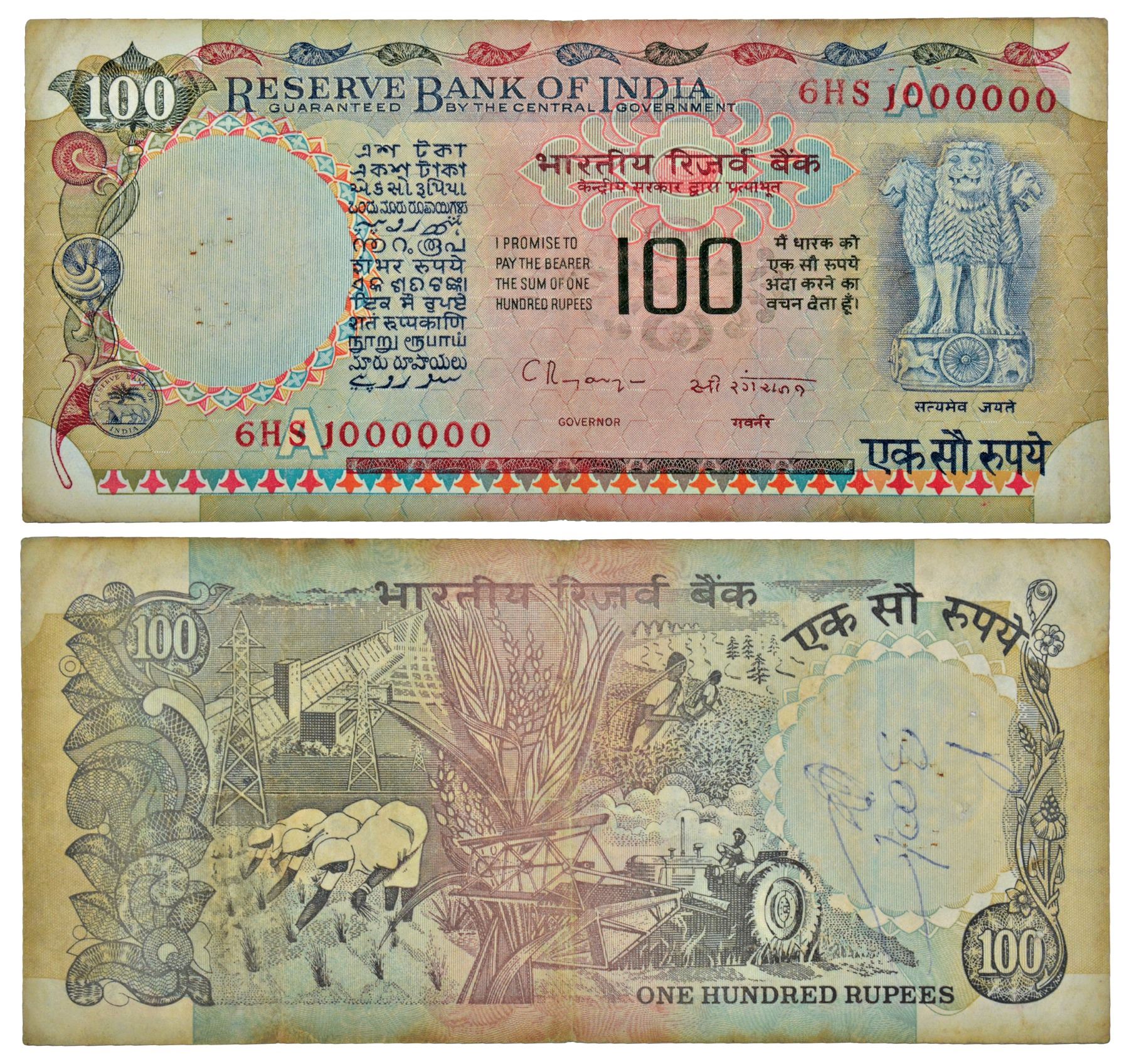 100 rupees, fancy number note, Agriculture series, ND (1992-1997), signed by C. Rangarajan, inset 'A', serial no.: 6HS 1000000 (1 million), J&R 6.7.10.5B.