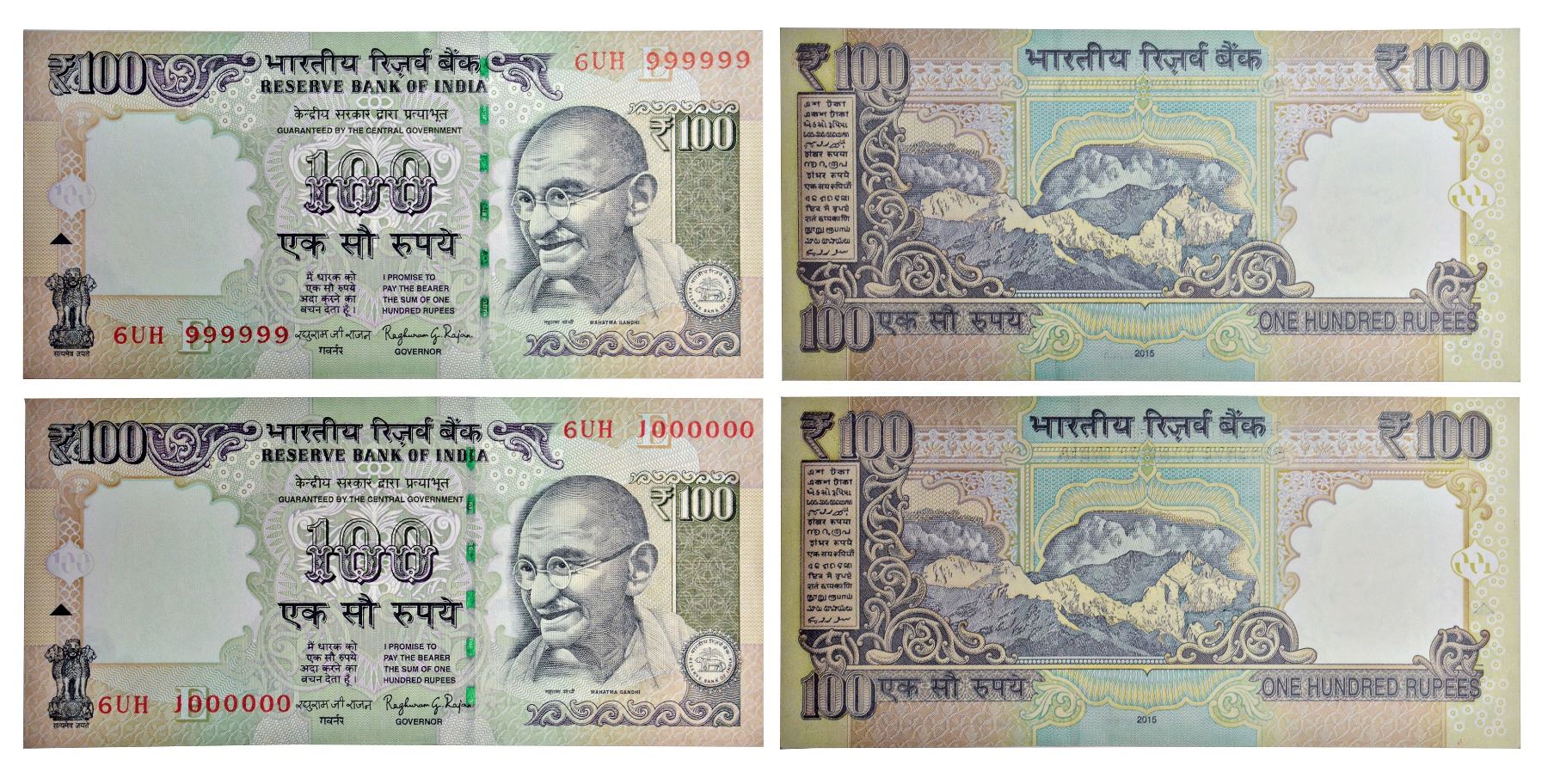 100 rupees, fancy number notes (2), Gandhi series, 2015, signed by Raghuram Rajan, inset 'E', serial no.: 6UH 999999 and 6UH 1000000 (1 million). (2 notes)