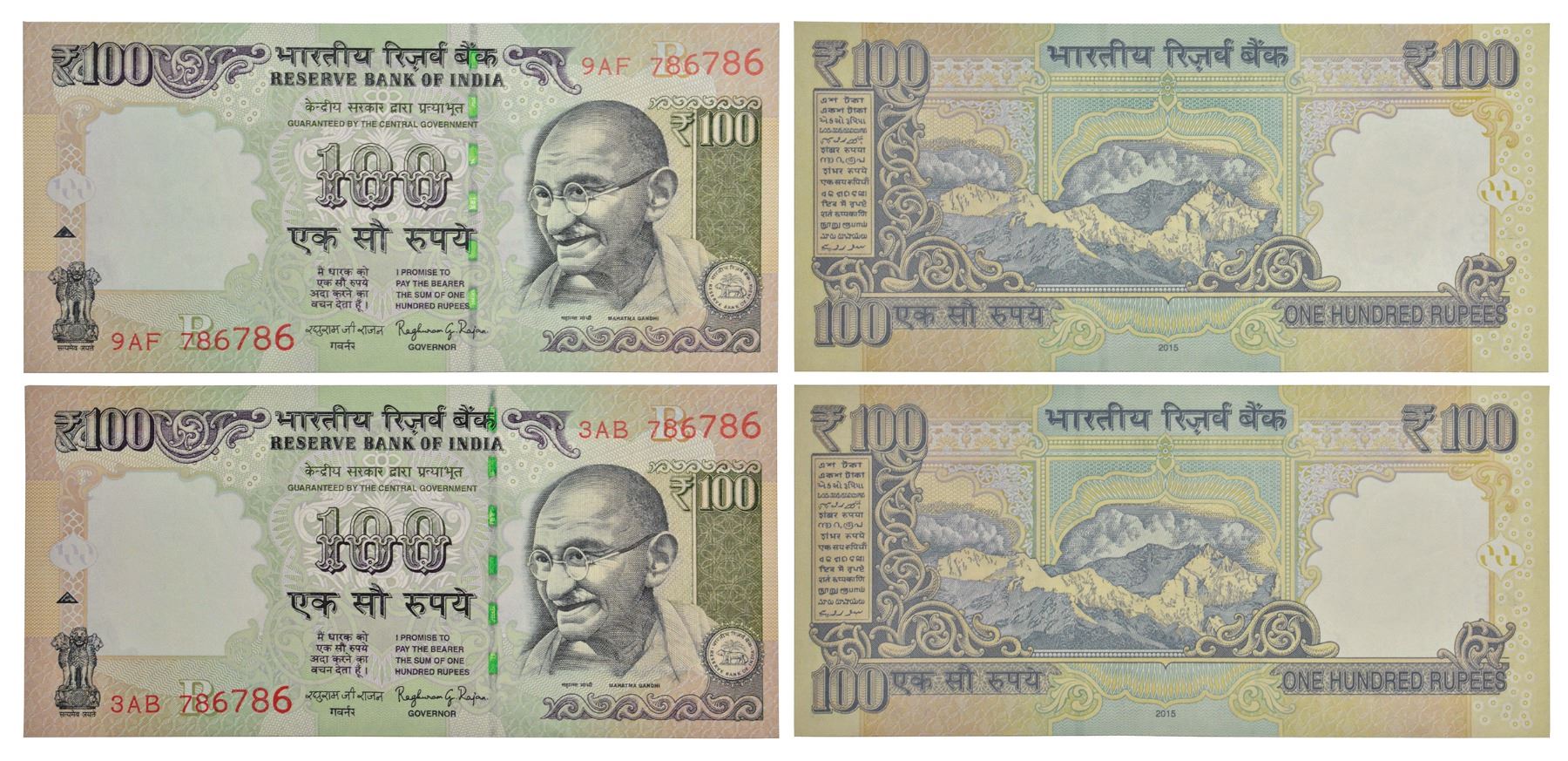 100 rupees, fancy number pair of 2 notes, Gandhi series, 2015, signed by Raghuram Rajan, inset 'R', telescopic serial no.: 3AB 786786 and 9AF 786786.(2 notes)