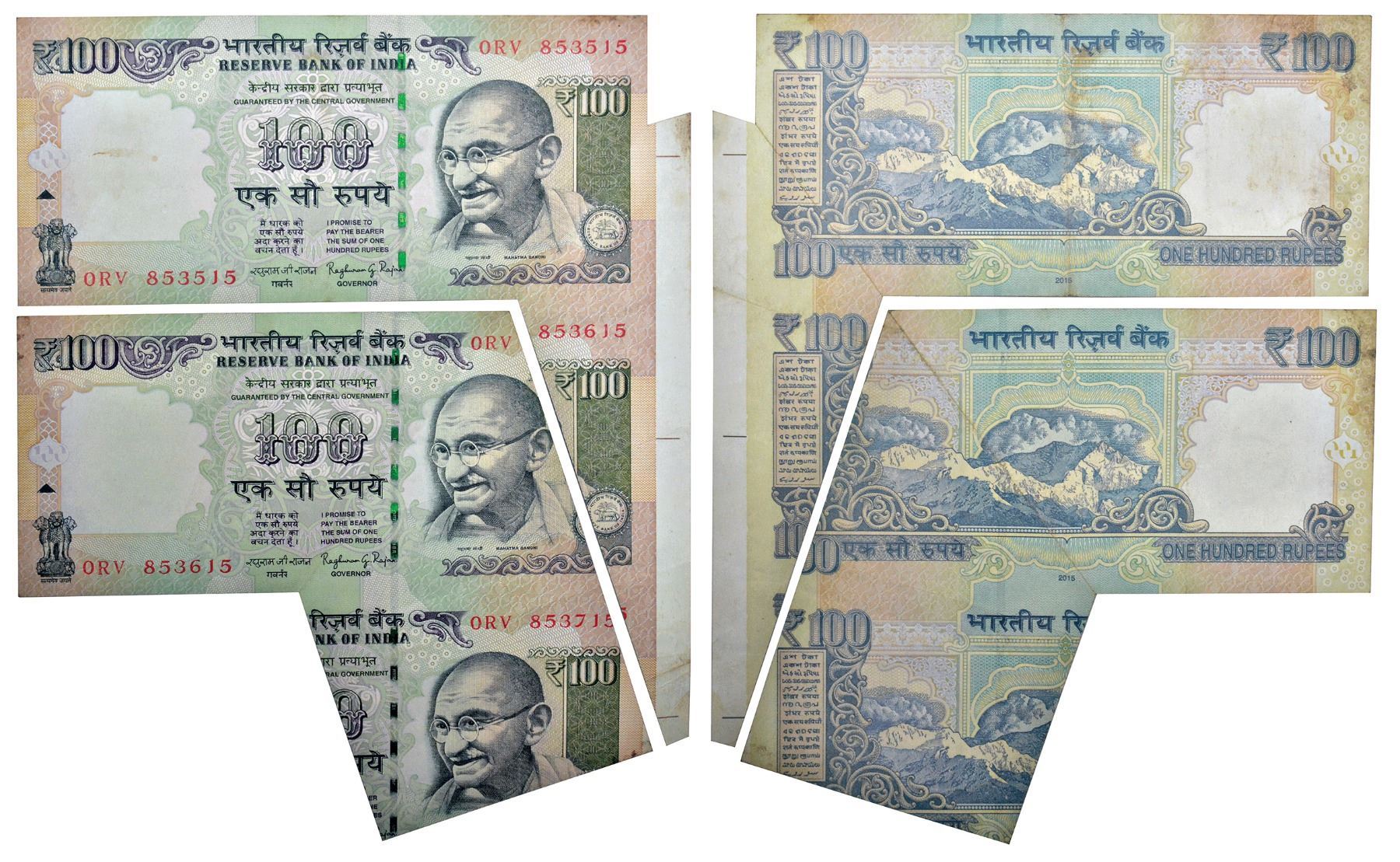 100 rupees, misprint note (2), 2015, signed by Raghuram G. Rajan, serial no.: 0RV 853515 / 853615 / 853715, with misaligned cutting, part of sheet error. (2 notes)