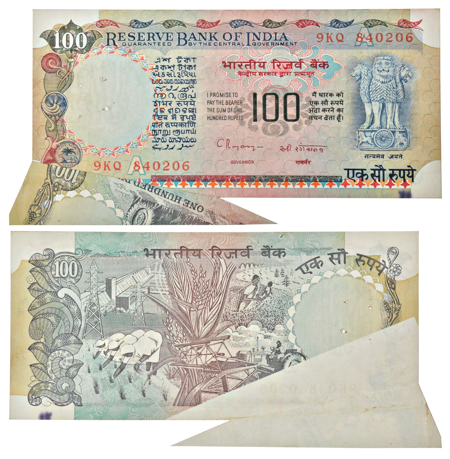 100 rupees, misprint, Agriculture series, ND (1992-1997), signed by C. Rangarajan, inset 'A', serial no.: 9KQ 840206, flip error on reverse, pin holes and ink mark.