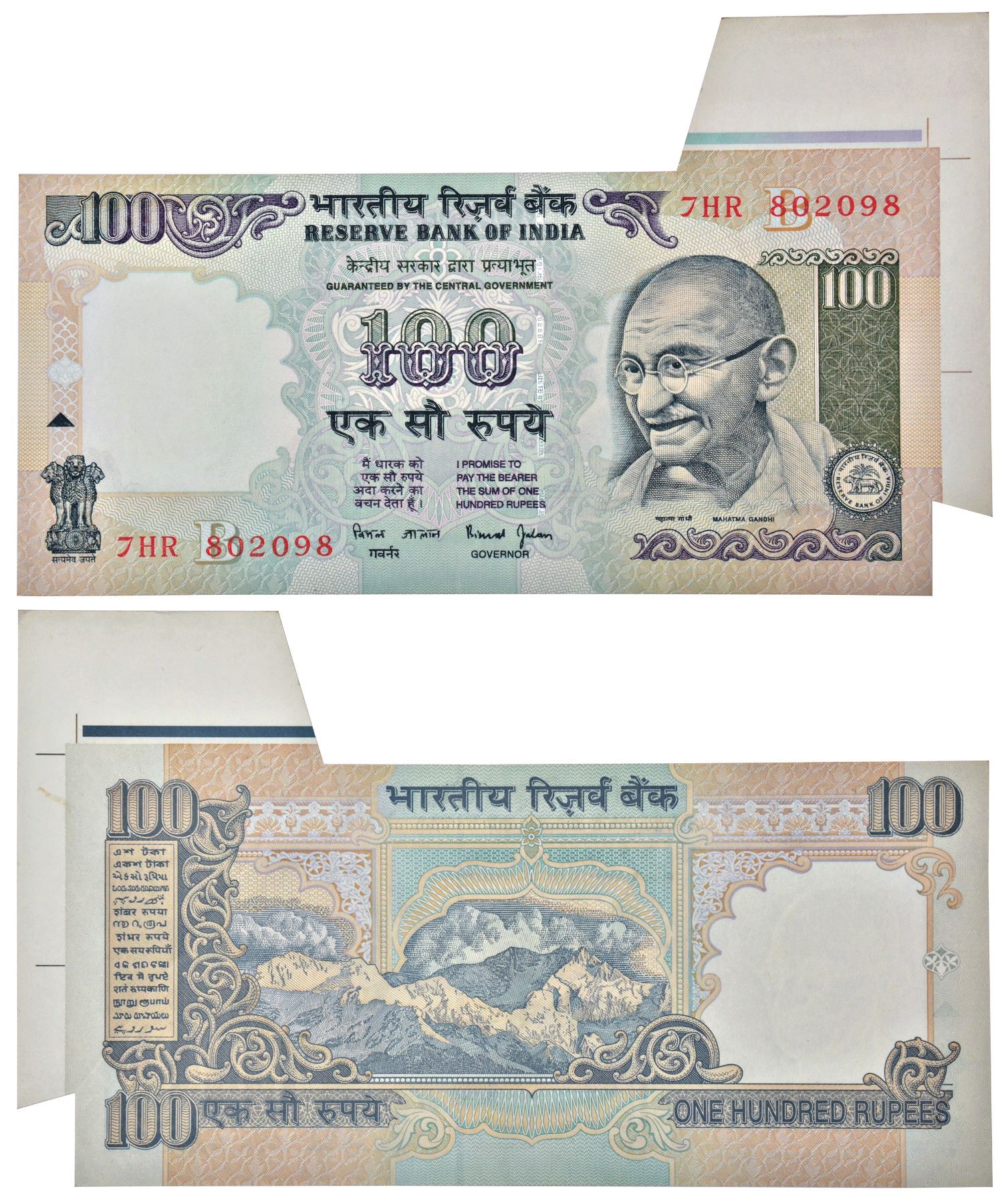 100 rupees, misprint, Gandhi series, ND (1997-2003), signed by Bimal Jalan, inset 'B', serial no.: 7HR 802098, extra paper on middle and upper right side.