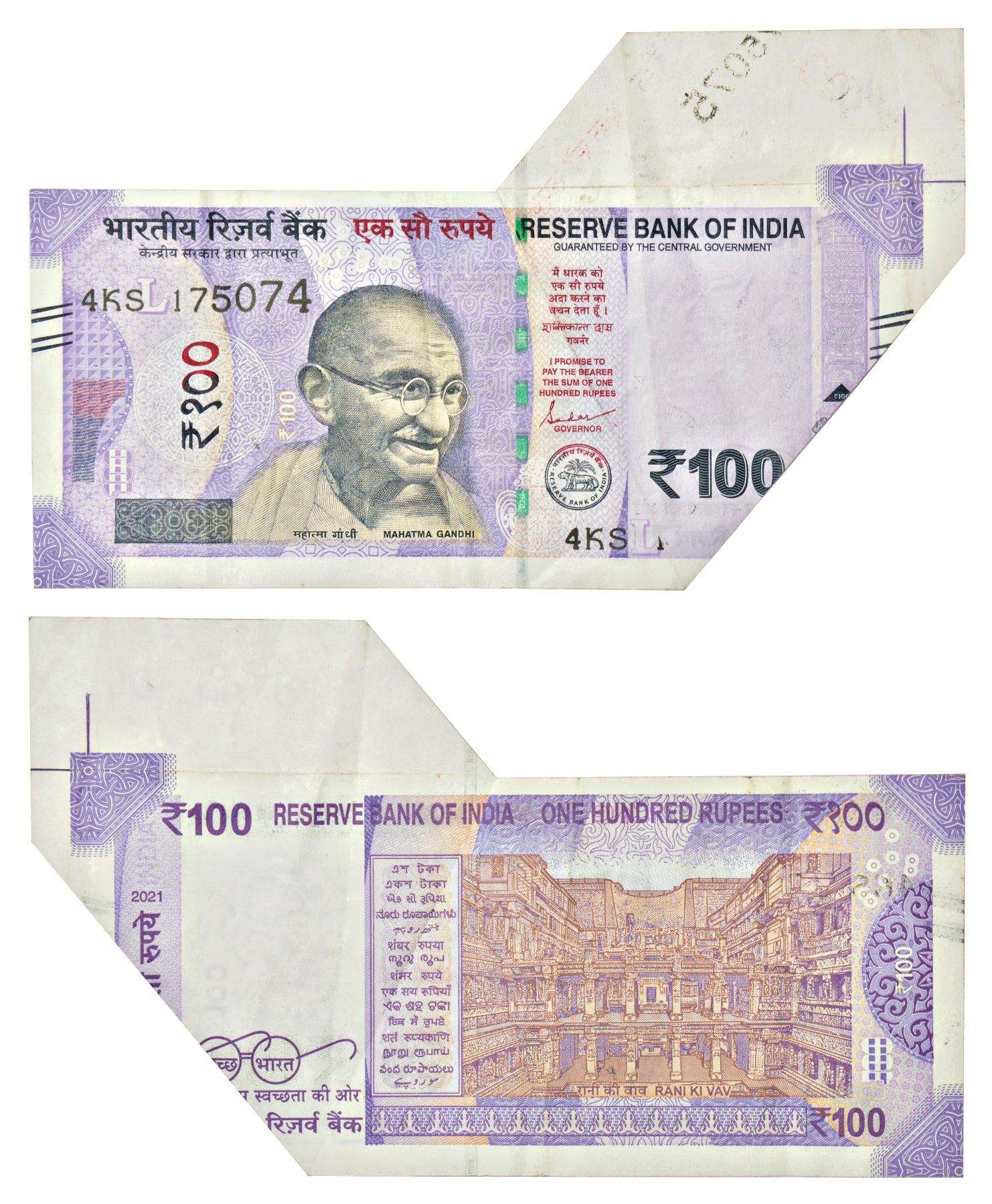 100 rupees, misprint, new Gandhi series, 2021, signed by Shashikanta Das, inset 'L', serial no.: 4KS 175074, lower right side serial number partly seen and misaligned cutting part of the sheet error.