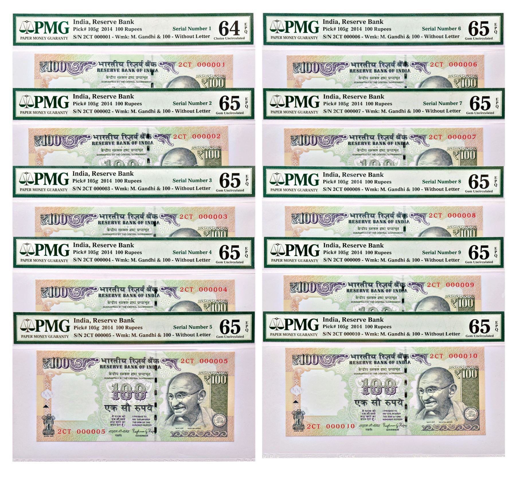 100 rupees, set of 10 fancy number notes, Gandhi series, 2014, signed by Raghuram G. Rajan, without inset, serial no.: 2CT 000001 to 000010. (10 notes)