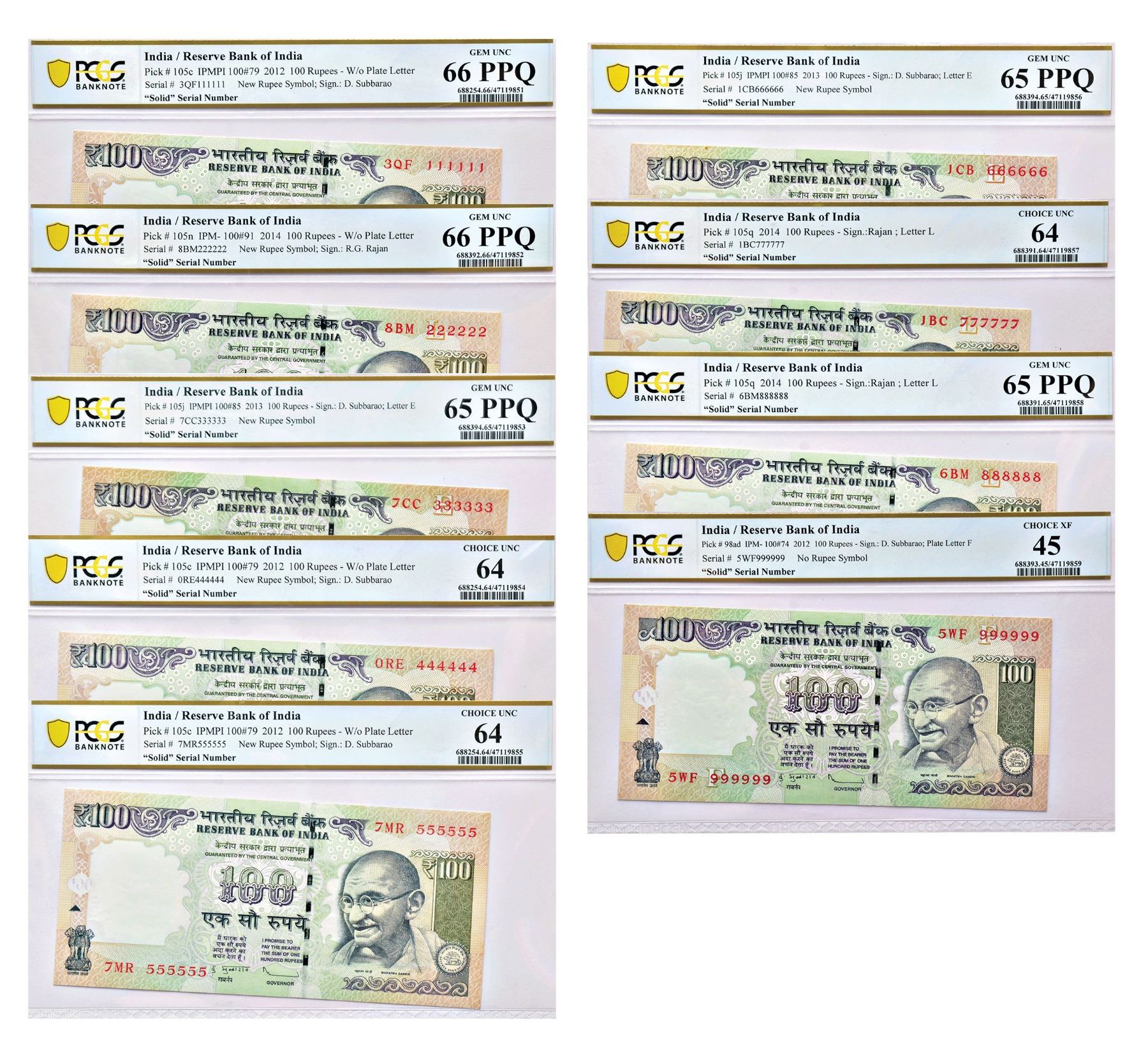 100 rupees, set of 9 fancy number notes, Gandhi series, signed by D. Subbarao and Raghuram G. Rajan, serial nos.: 111111 to 999999. (9 notes)