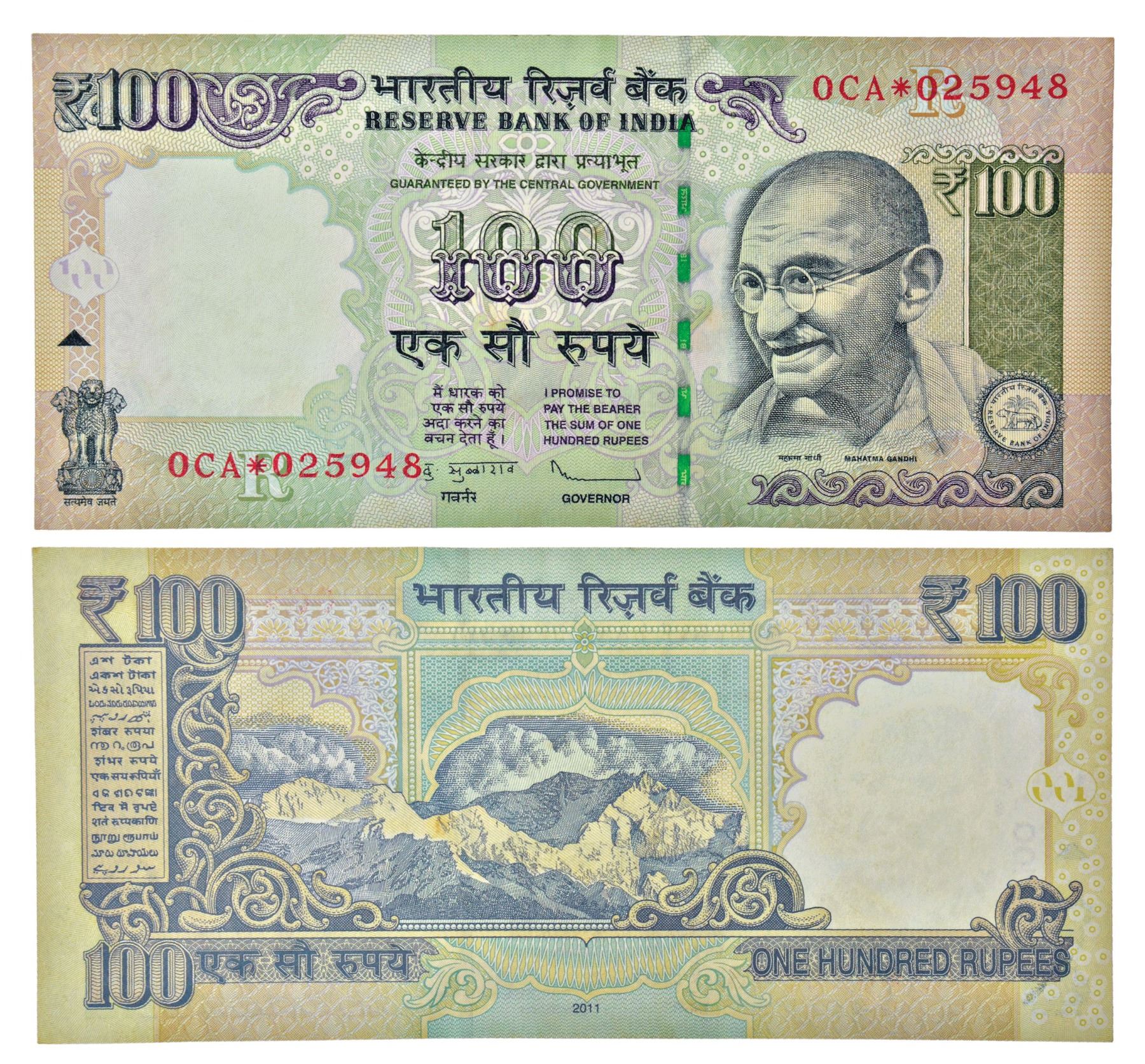 Paper Money: 100 rupees, star series, Gandhi series, 2011, signed by D. Subbarao, inset 'R', serial no.: 0CA*025948.