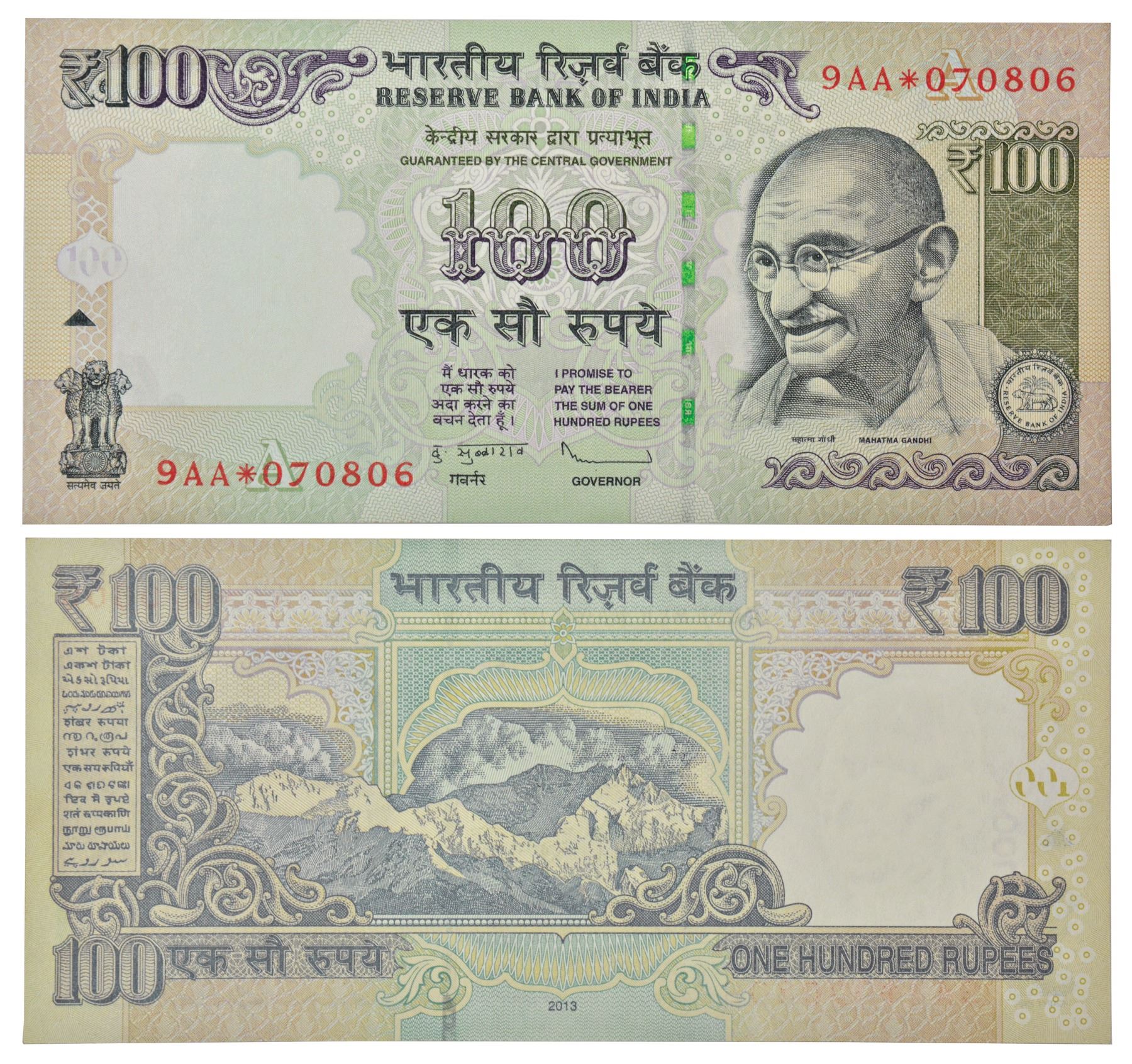 Paper Money: 100 rupees, star series, Gandhi series, 2013, signed by D. Subbarao, inset 'A'