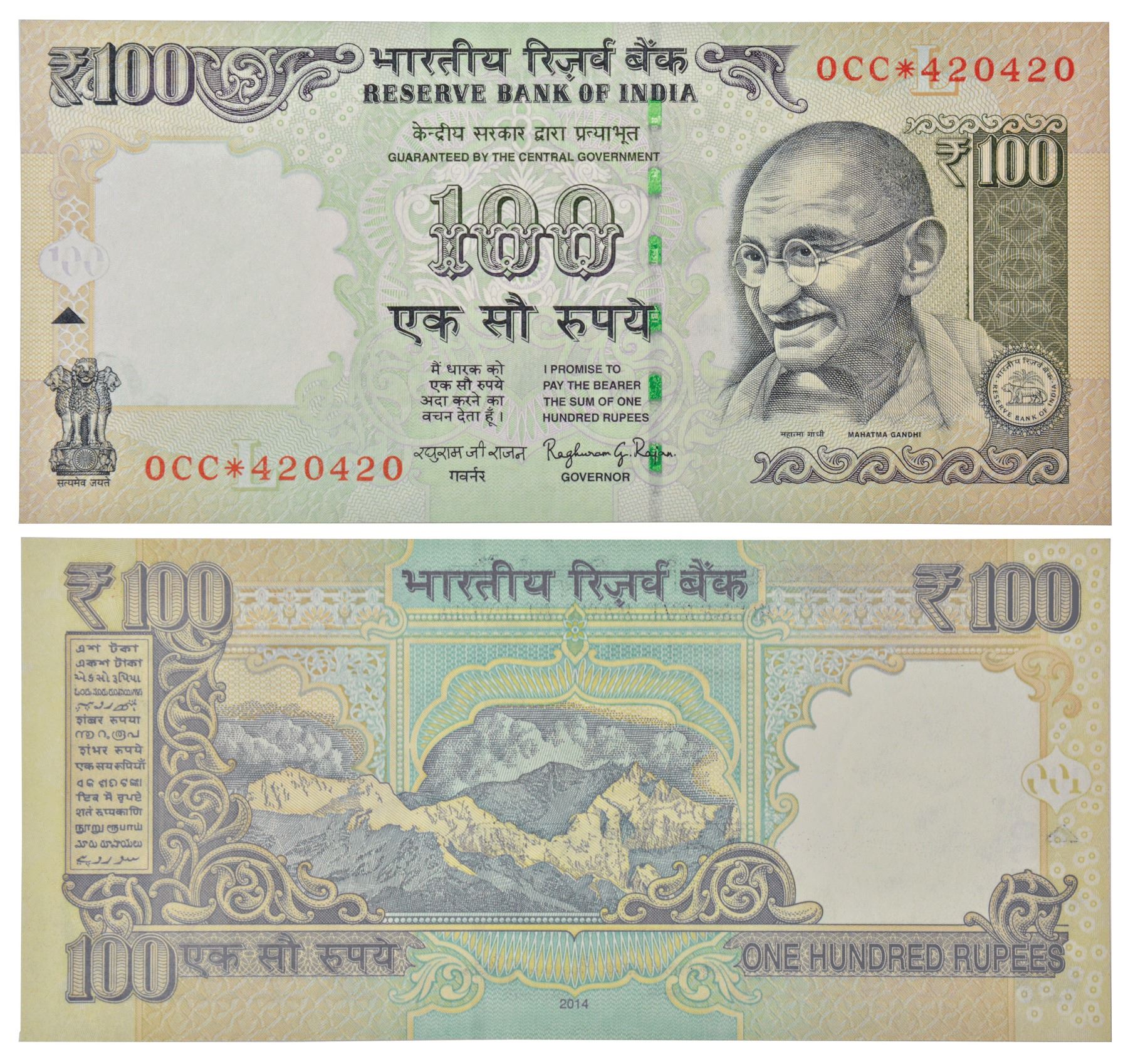 100 rupees, star series, Gandhi series, 2014, signed by Raghuram Rajan, inset 'L', serial no.: 0CC*420420.