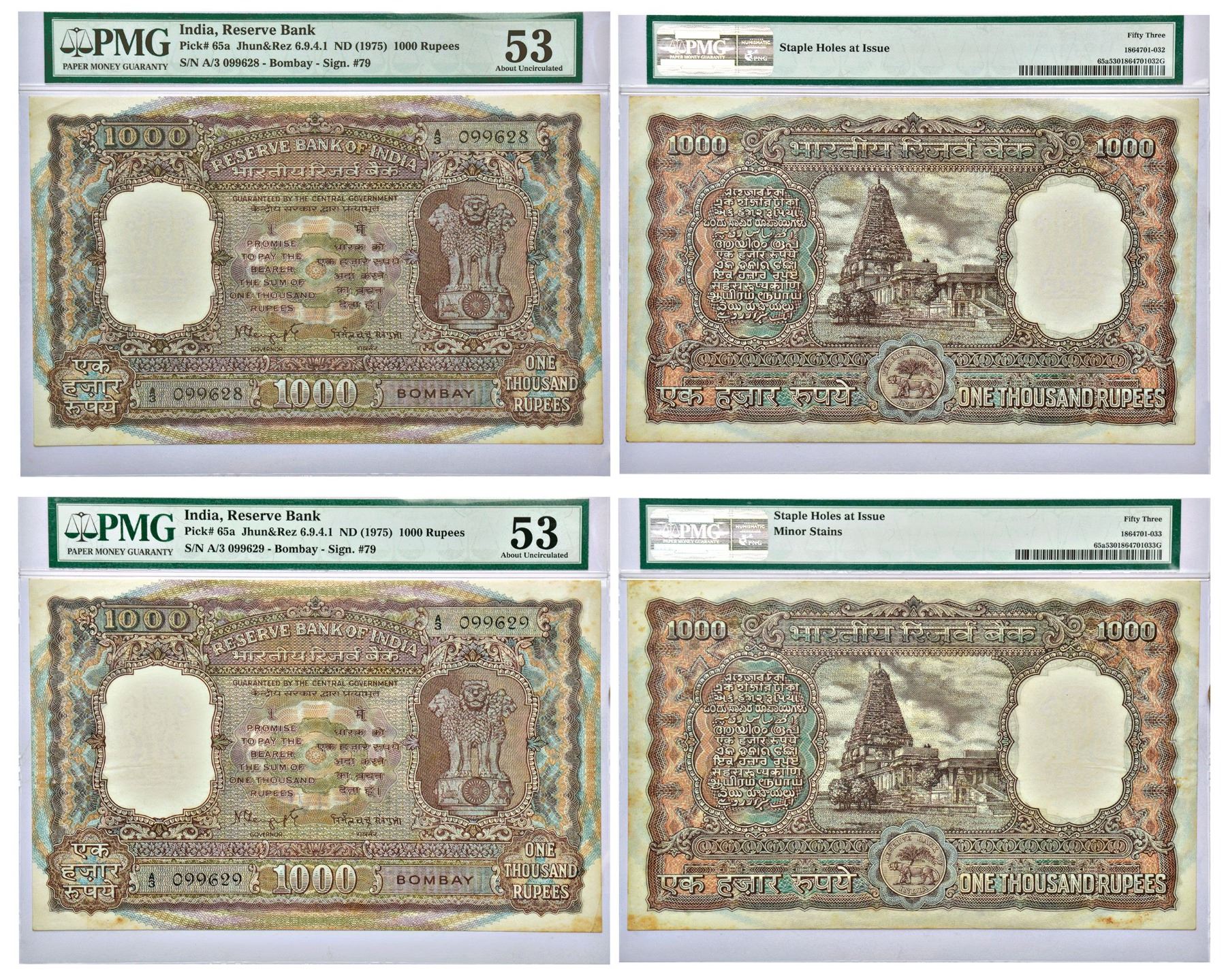 1000 rupees (2), Tanjore temple series, Bombay circle, ND (1975), signed by N.C. Sengupta, two consecutive serial no.: A3 099628 and 099629, correct in Hindi, J&R 6.9.4.1. (2 notes)