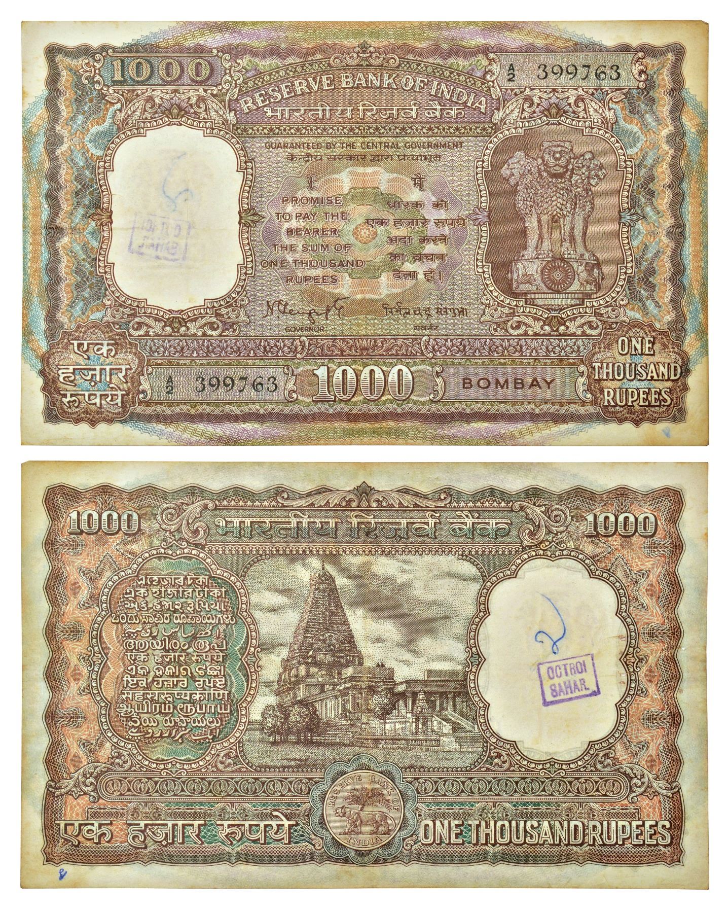 1000 rupees, Tanjore temple series, Bombay circle, ND (1975), signed by N. C. Sengupta, serial no.: A2 399763, correct रुपये in Hindi, J&R 6.9.4.1.