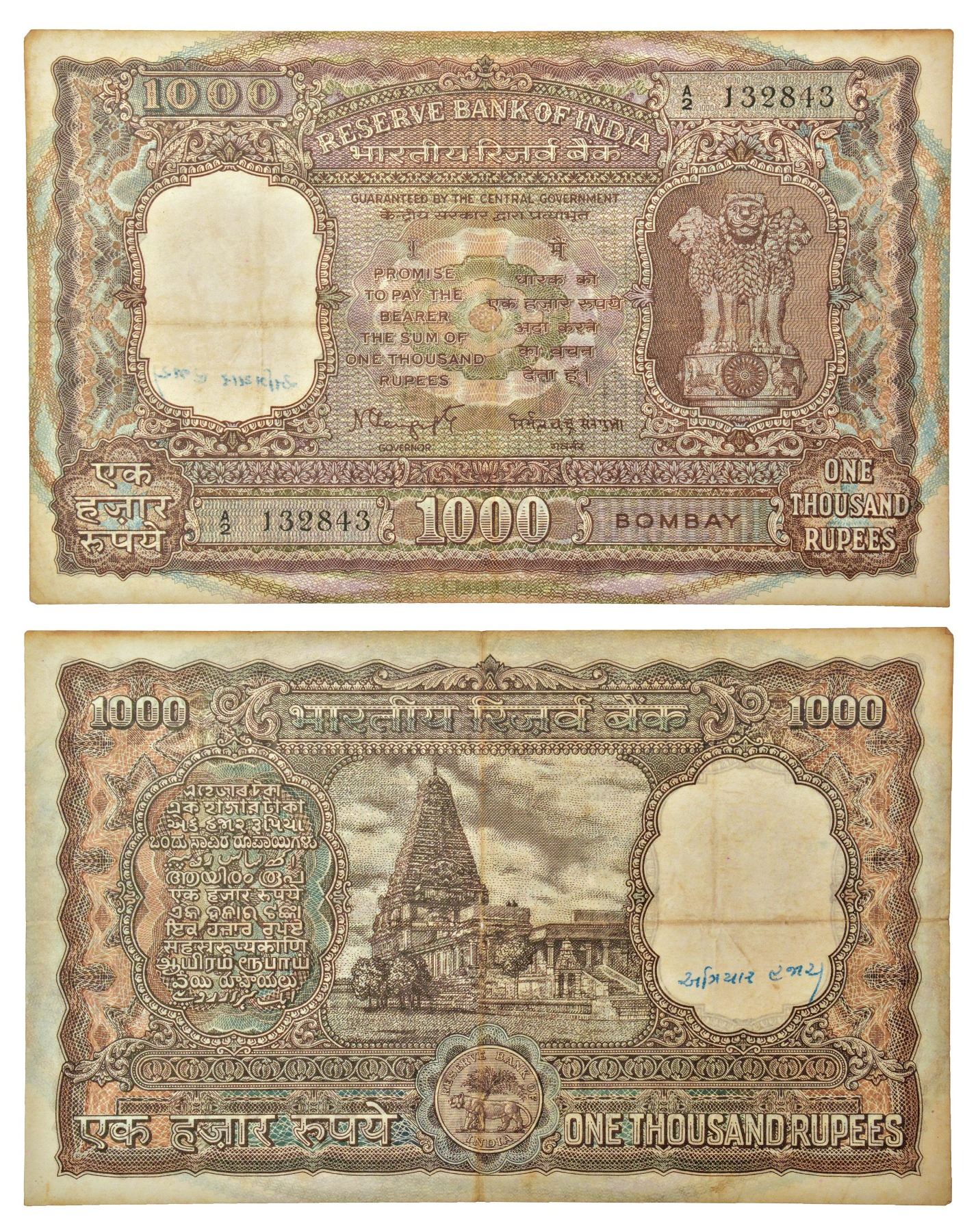 1000 rupees, Tanjore temple series, Bombay circle, ND (1975), signed by N.C. Sengupta, serial no.: A2 132843, correct in Hindi, J&R 6.9.4.1.