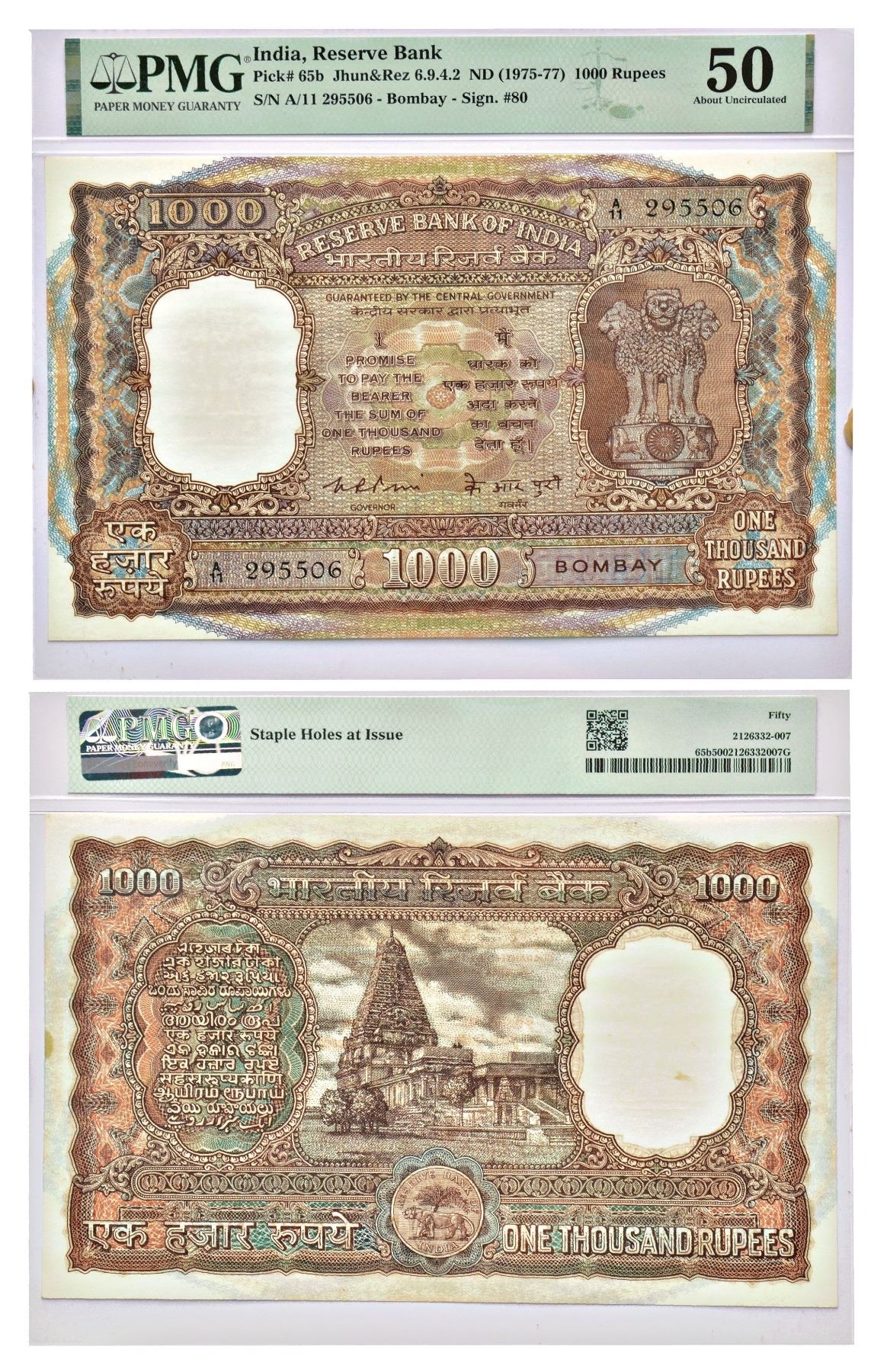 Paper Money: 1000 rupees, Tanjore temple series, ND (1975-77), Bombay circle, signed by K.R. Puri,