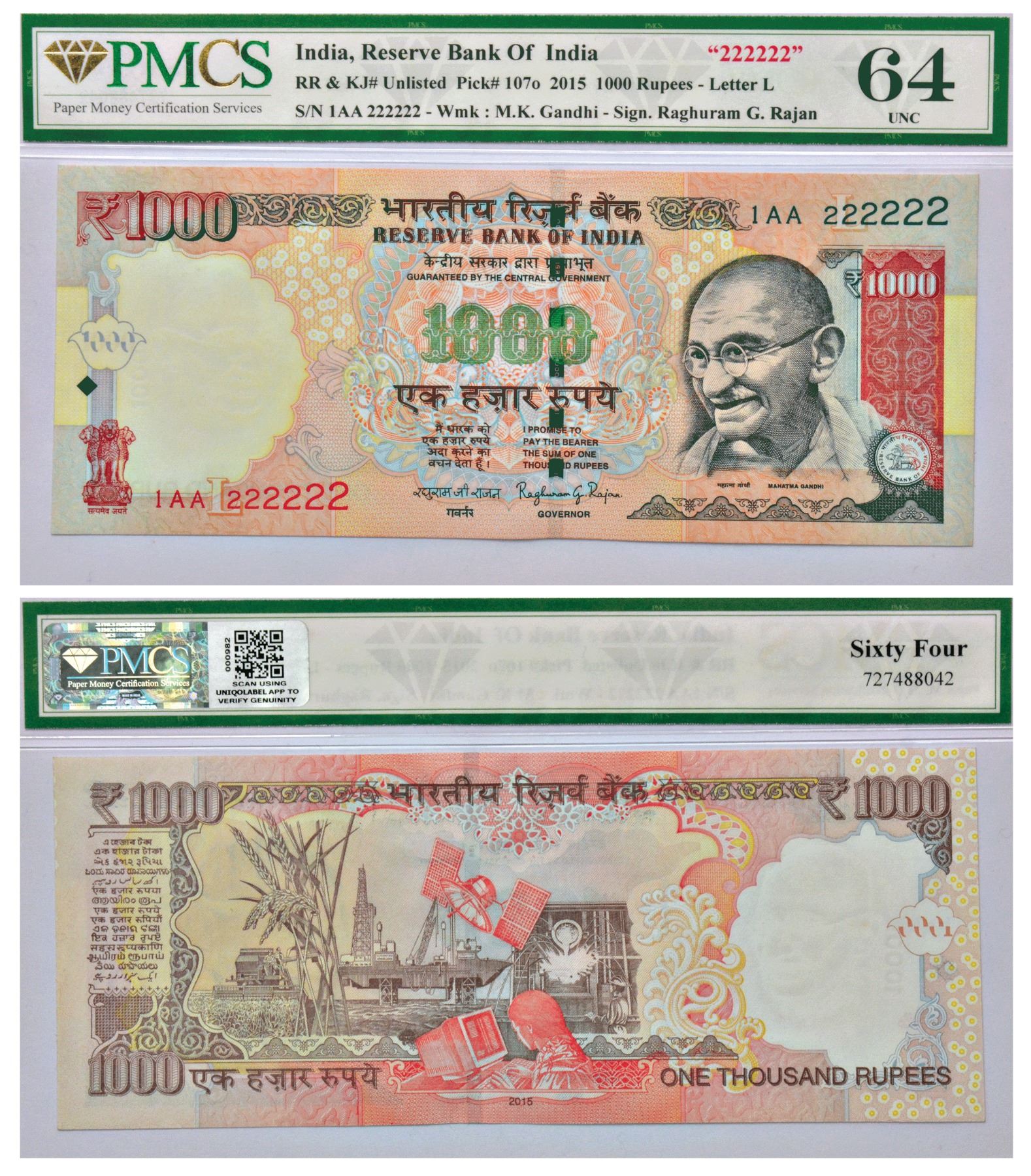 1000 rupees, fancy number, Gandhi series, 2015, signed by Raghuram Rajan, inset 'L', telescopic serial no.: 1AA 222222, without braille line.