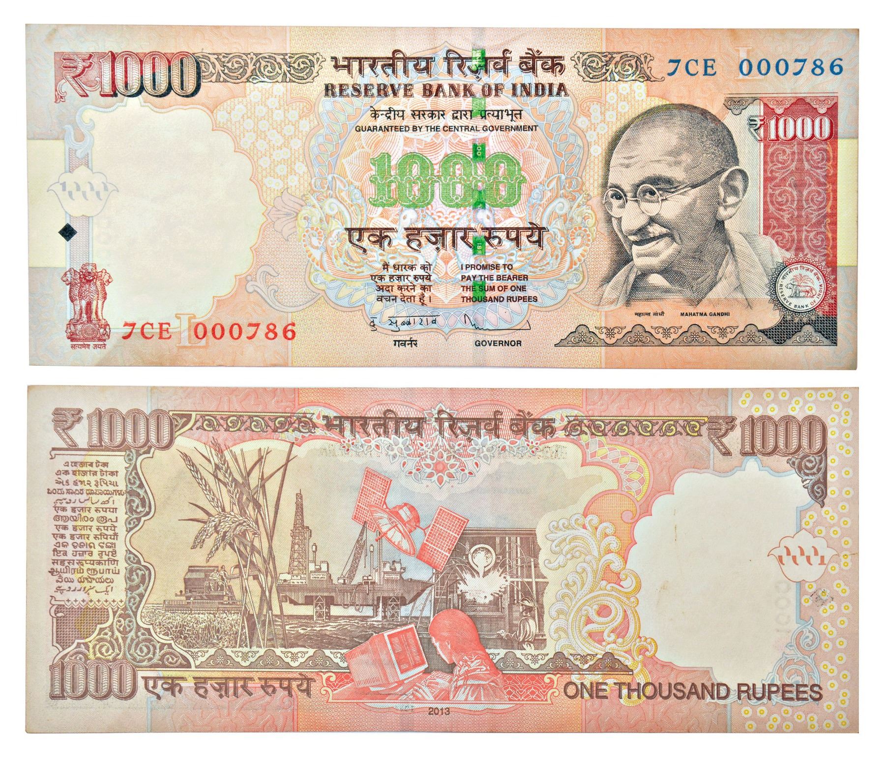 1000 rupees, fancy number note, Gandhi series, 2013, signed by D. Subbarao, inset 'L', serial no.: 7CE 000786.