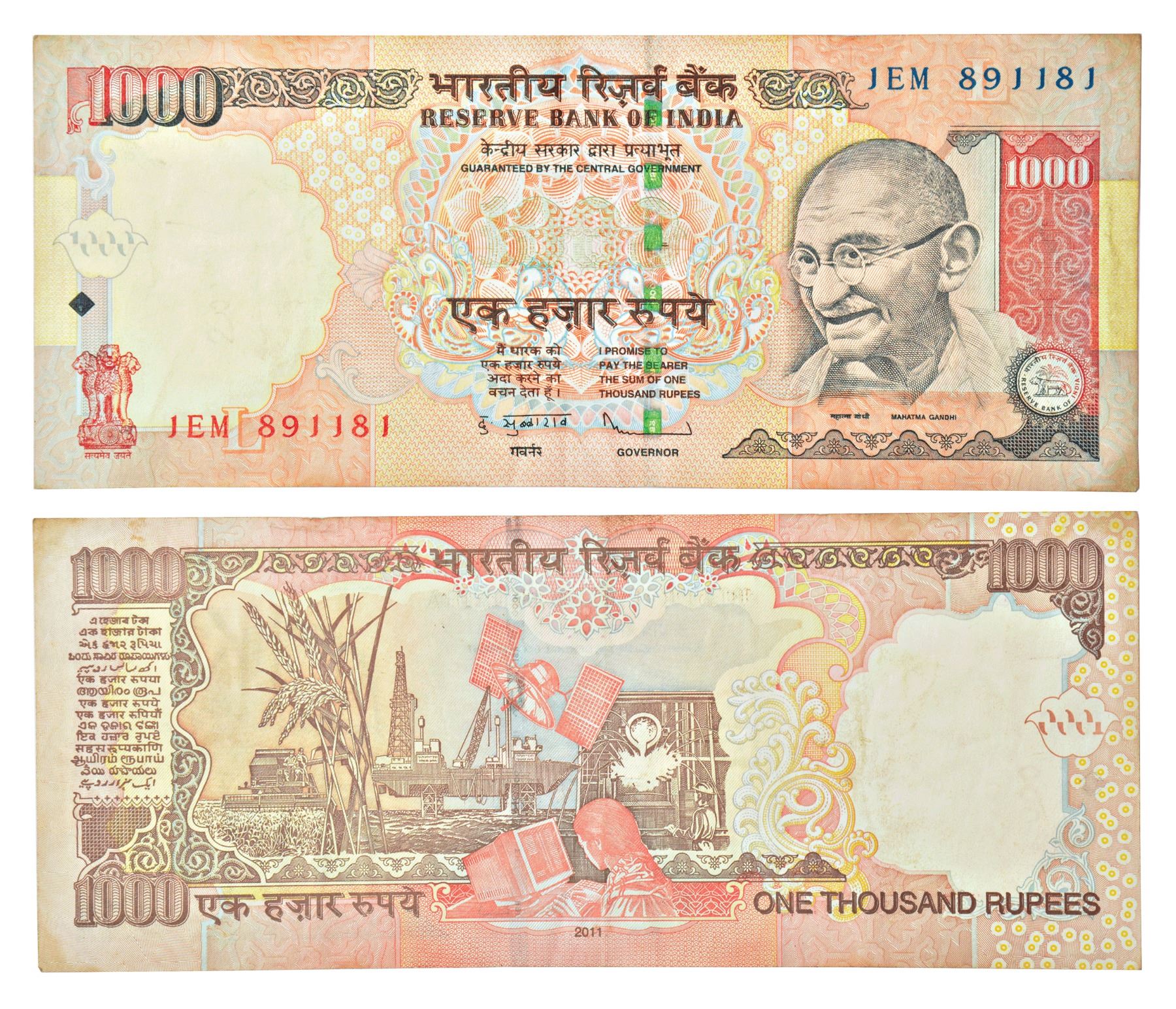 1000 rupees, misprint, Gandhi series, 2011, signed by D. Subbarao, inset 'L', serial no.: 1EM 891181, numerical value not printed on obverse.