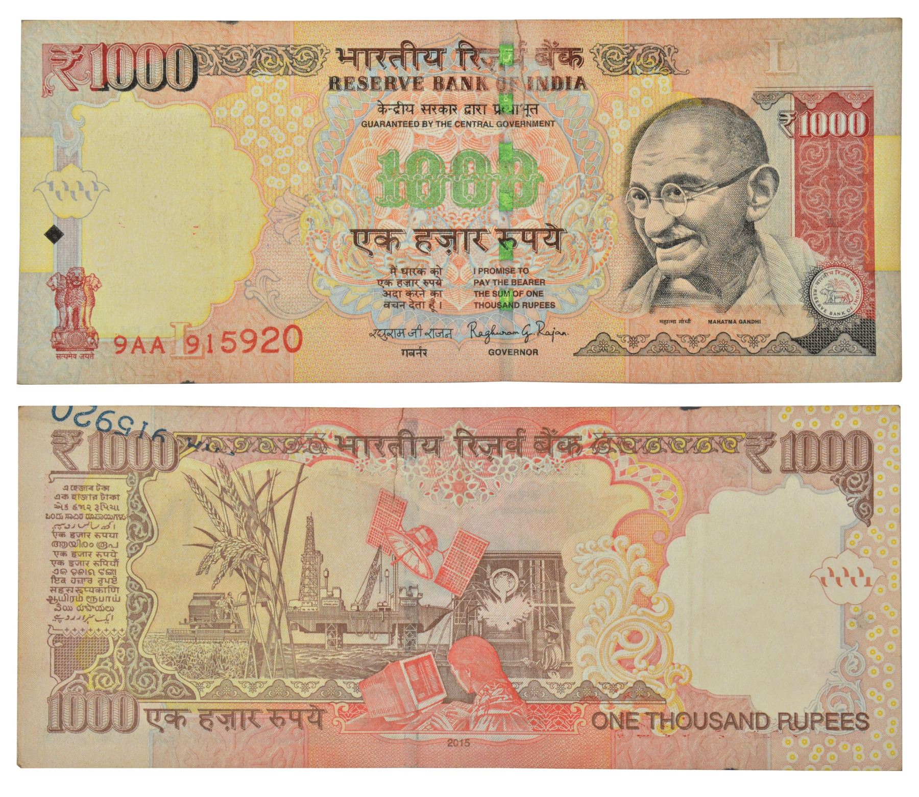 1000 rupees, misprint, Gandhi series, 2015, signed by Raghuram Rajan, inset 'L', serial no.: 9AA 915920, upper right side serial number not printed on obverse but on reverse, tattered from upper margin.