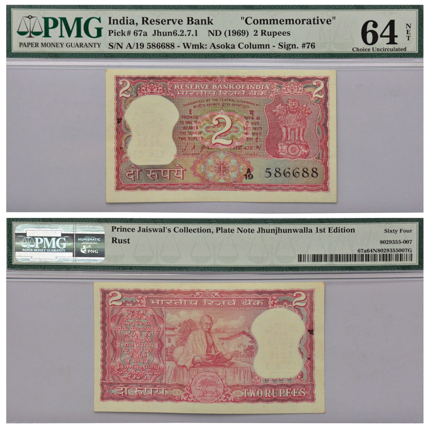 2 rupees, Gandhi on back series, ND (1969), signed by L.K. Jha, serial no.: A19 586688, J&R 6.2.7.1, plate specimen note of Jhunjhunwala 1st edition (1997).