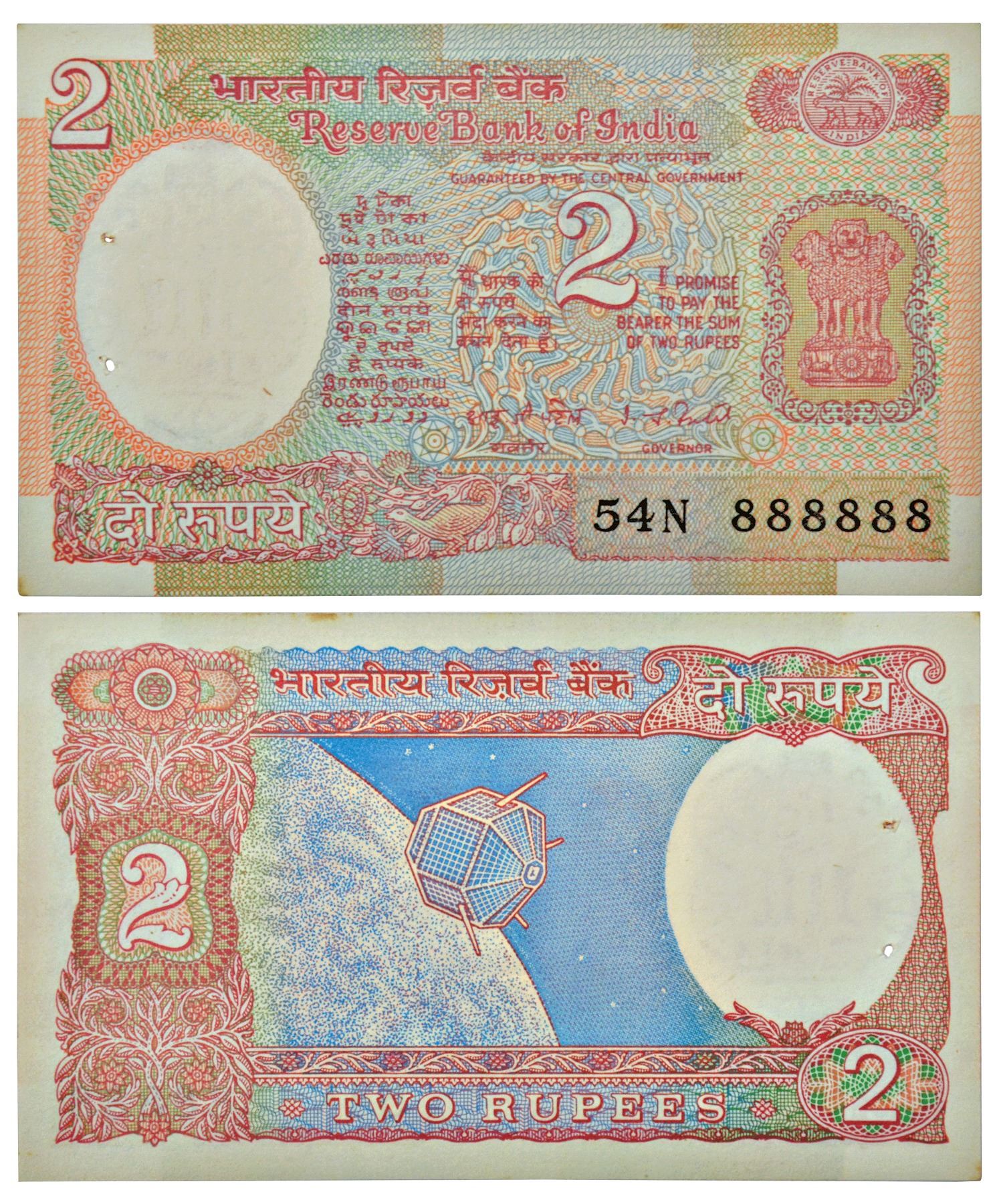 2 rupees, fancy number, Aryabhatta series, ND (1977-1982), signed by I.G. Patel, without inset, serial no.: 54N 888888. J&R 6.2.10.3B.